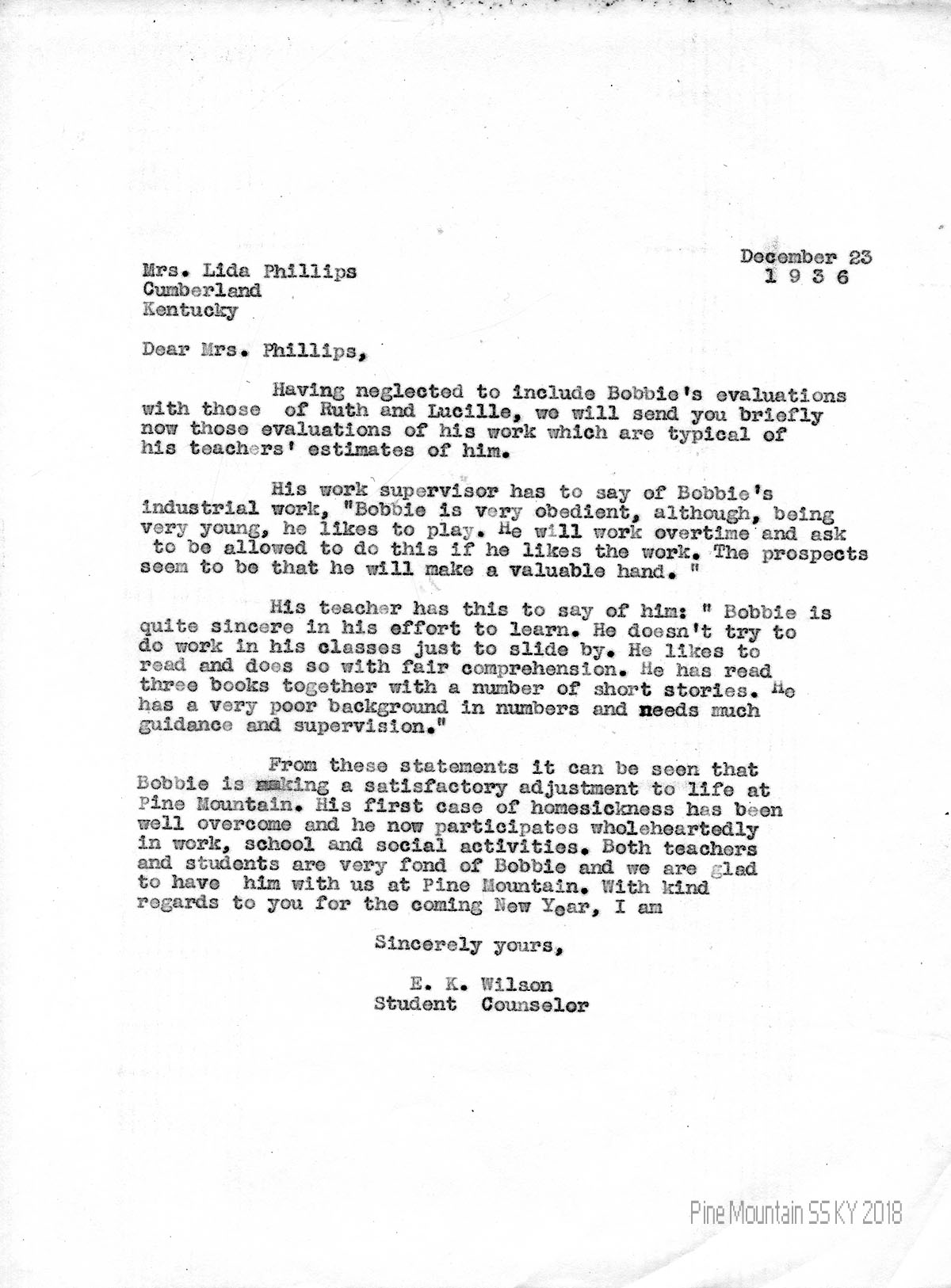 012 December 23, 1936. To Mrs. Lida Phillips from E.K. Wilson, sending teachers’ evaluations of Bobbie’s work and summarizing their comments: “Bobbie is quite sincere in his efforts to learn…. He likes to read and does so with fair comprehension….” Wilson concludes that “Bobbie is making a satisfactory adjustment to life at Pine Mountain. His first case of homesickness has been well overcome…. Both teachers and students are very fond of Bobbie….”