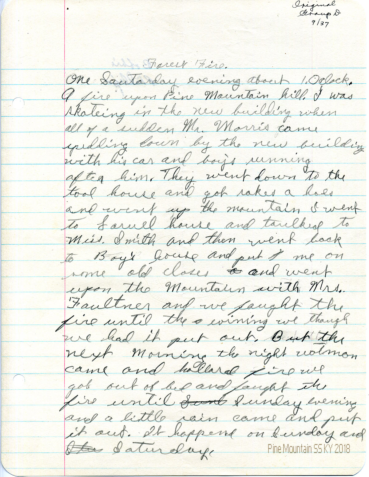 014-14a September 1937. [Notation in top margin: “Original Group D 9/37”] A two-page handwritten narrative by Bobbie Phillips titled “Forest Fire” in which he describes a two-day fire on the mountain and the School students and teachers’ effort to fight it. Mentions Miss Smith and Mrs. [Barbara] Faulkner.