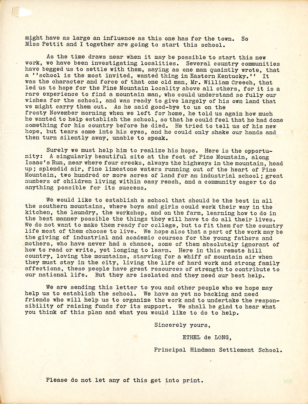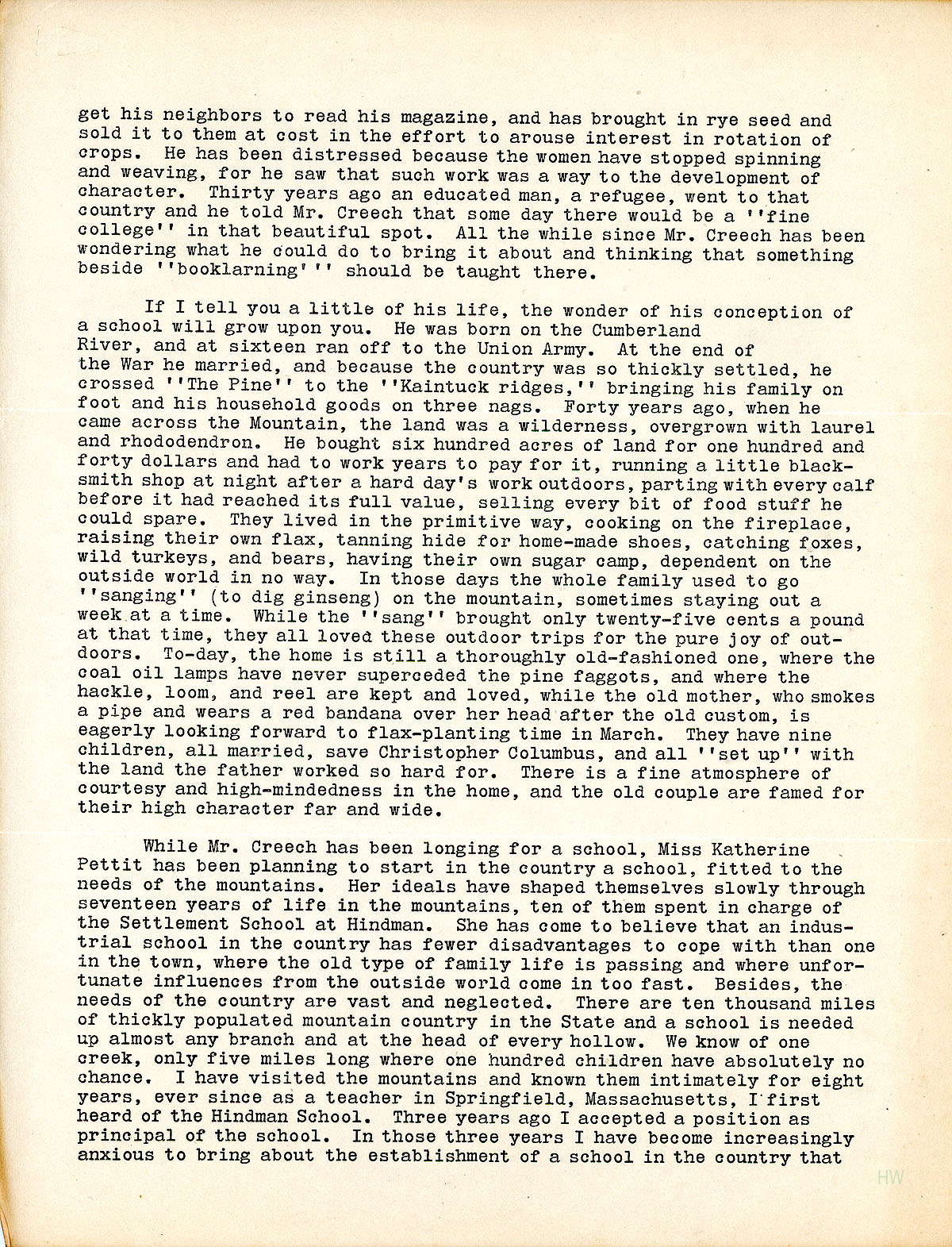 TAGS: Ethel de Long, Hindman Settlement School, Pine Mountain, appeal letter, Anglo-Saxon heritage, educational opportunities, geography, PMSS School planning, Turner brothers, Big Laurel, community cooperation, William Creech meeting, Creech life story, Turner family, employment opportunities
