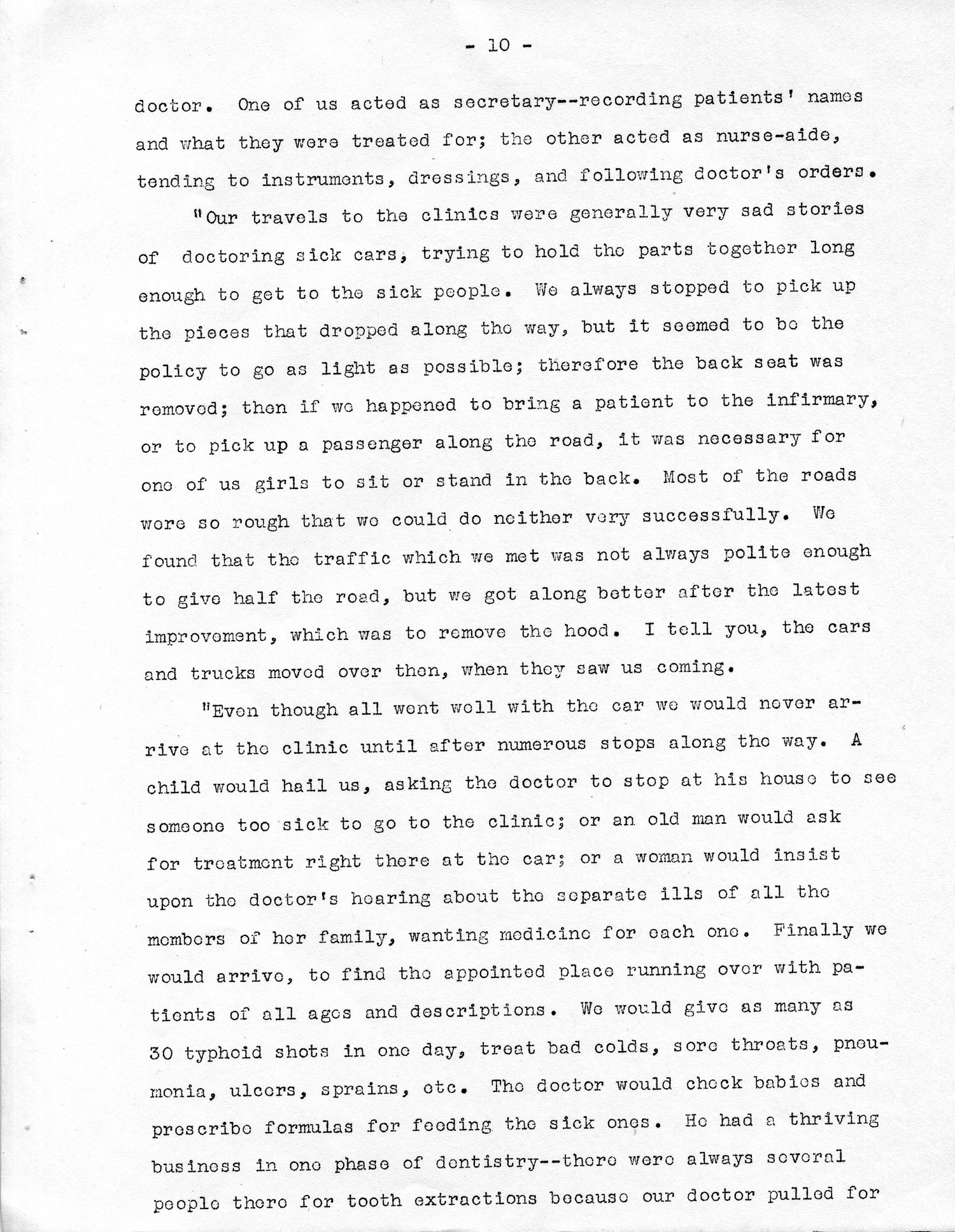 “Even though all went well with the car we would never arrive at the clinic until after numerous stops along the way. A child would hail us, asking the doctor to stop at his house to see someone too sick to go to the clinic; or an old man would ask for treatment right there at the car, or a woman would insist upon the doctor’s hearing about the separate ills of all the members of her family, wanting medicine for each one. Finally, we would arrive, to find the appointed place running over with patients of all ages and descriptions. We would give as many as 30 typhoid shots in one day, treat bad colds, sore throats, pneumonia, ulcers, sprains, etc. The doctor would check babies and prescribe formulas for feeding the sick ones. He had a thriving business in one phase of dentistry — there were always several people there for tooth extractions because our doctor pulled for…