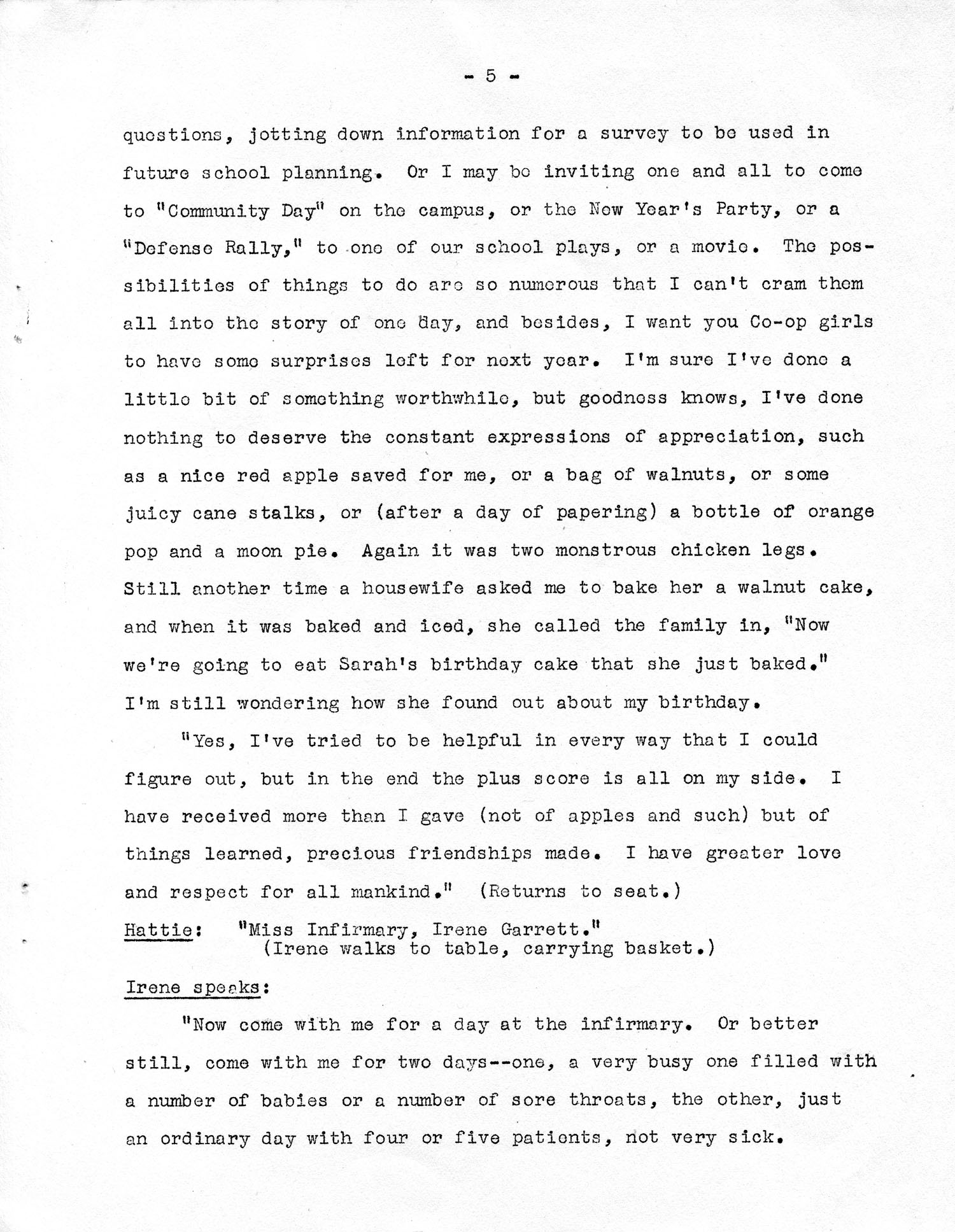 The following script contains the narratives of seven students and is coordinated by a Master of Ceremonies, Hattie Sturgill, a student who worked with Grace Rood at the School Infirmary. She introduces each student and the student then describes the work they engaged as a member of the Community Group.