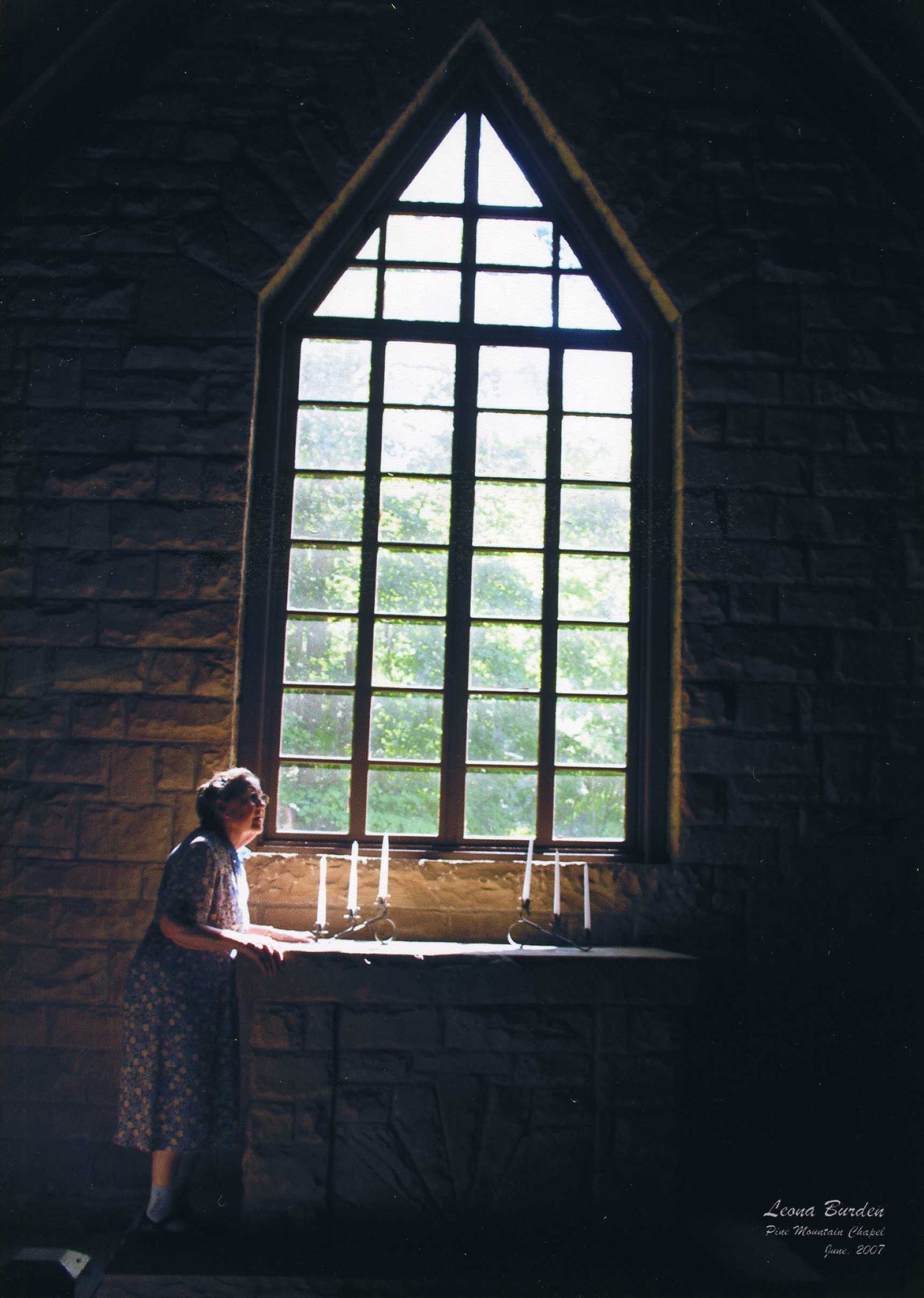 - Leona P. Burden standing next to altar in the Chapel at Pine Mountain, 2007. [burden_leona_001.jpg]