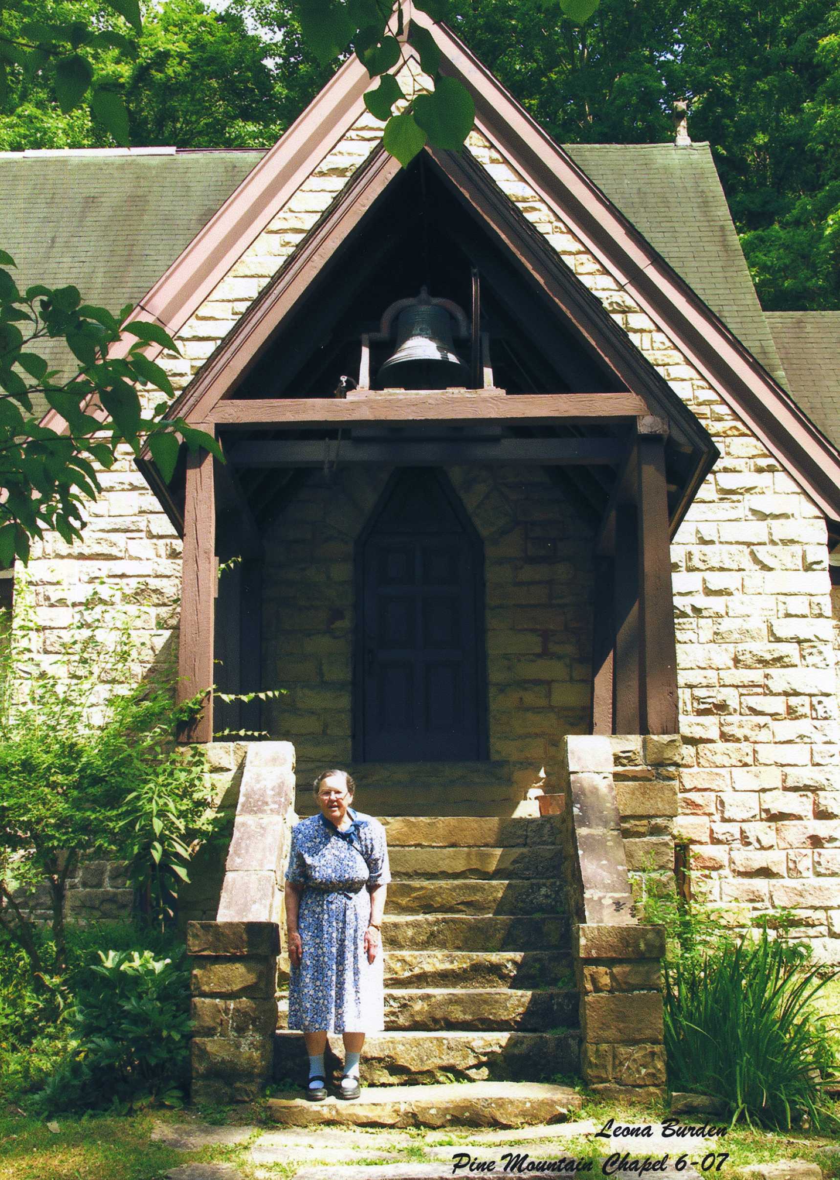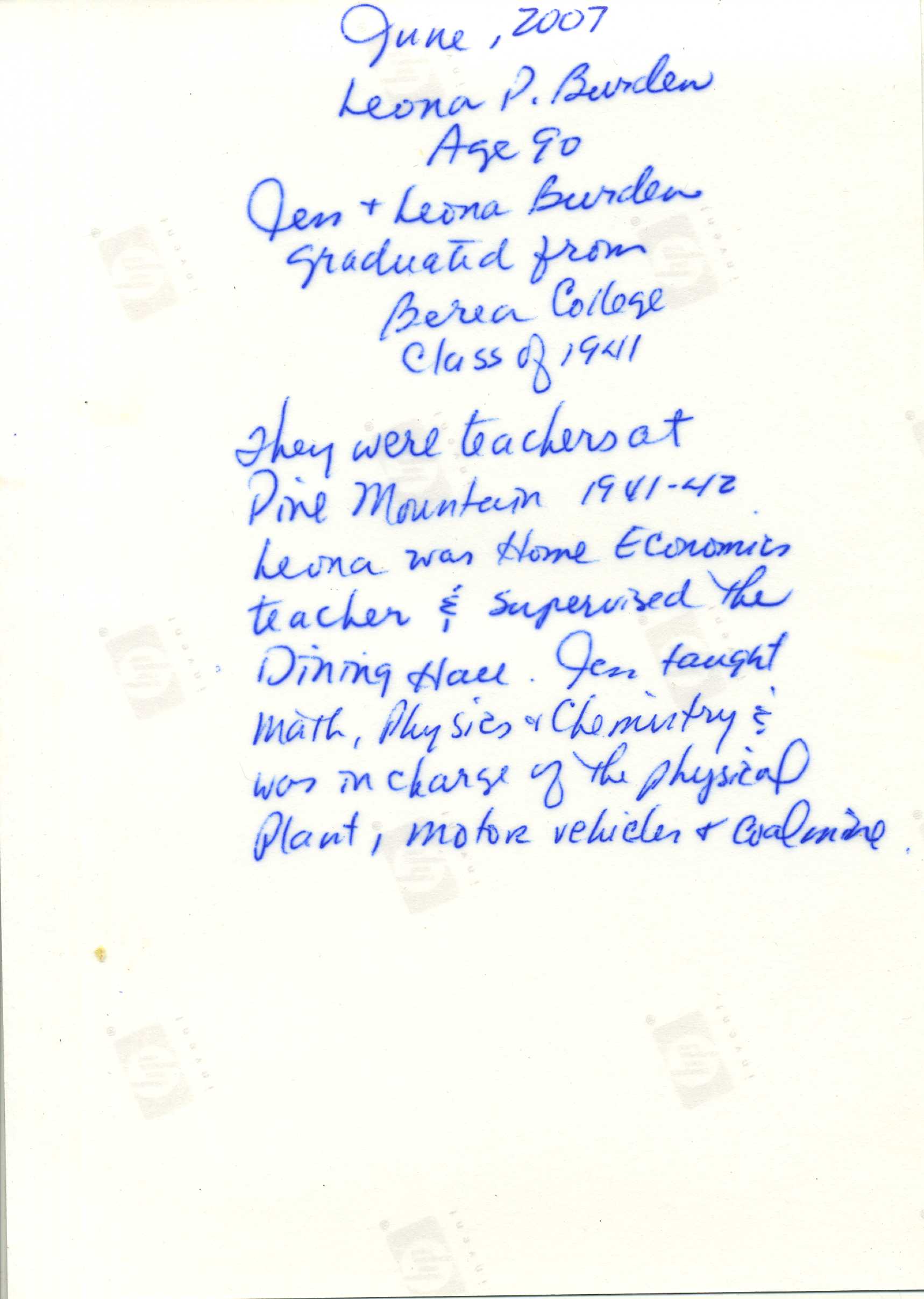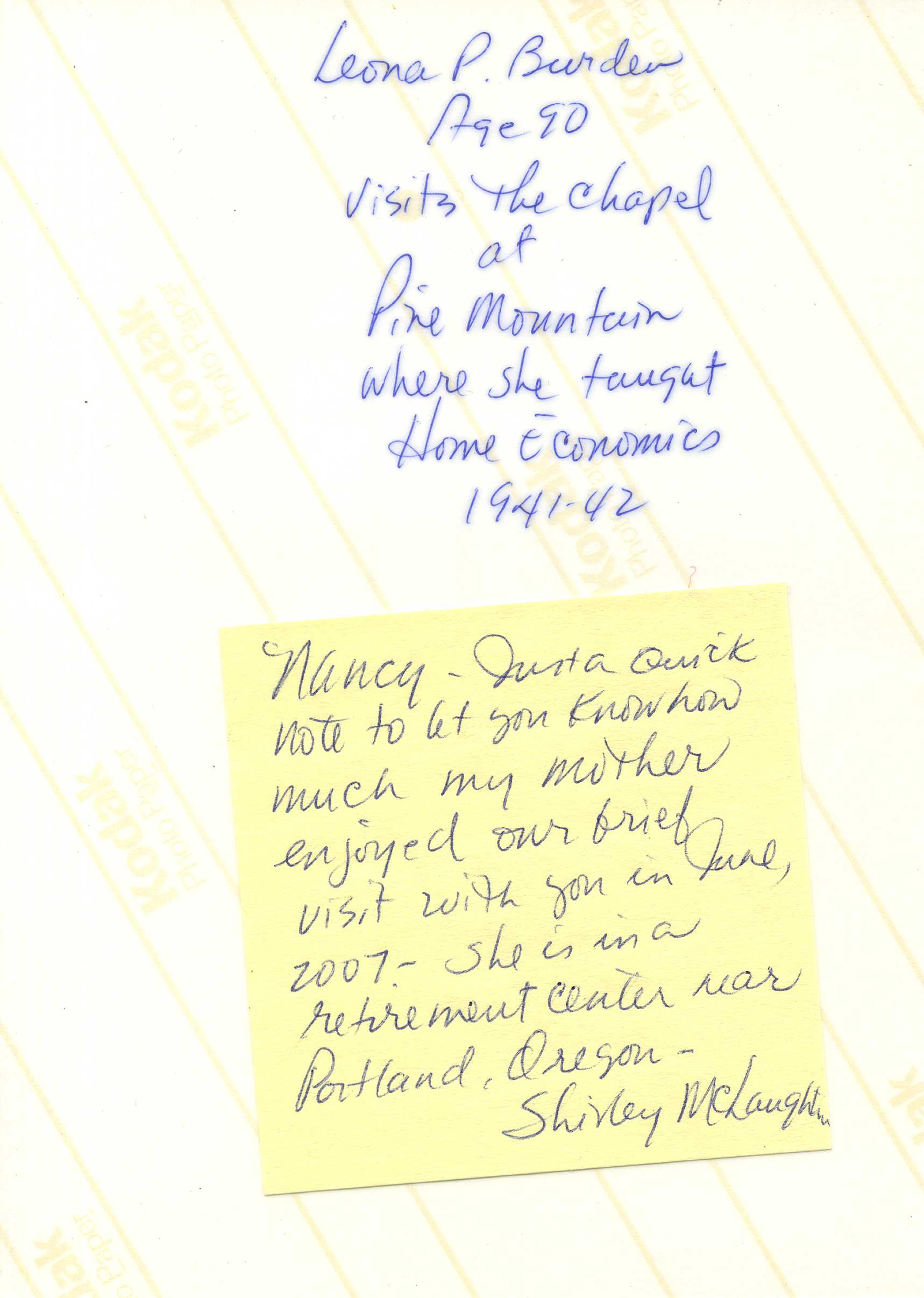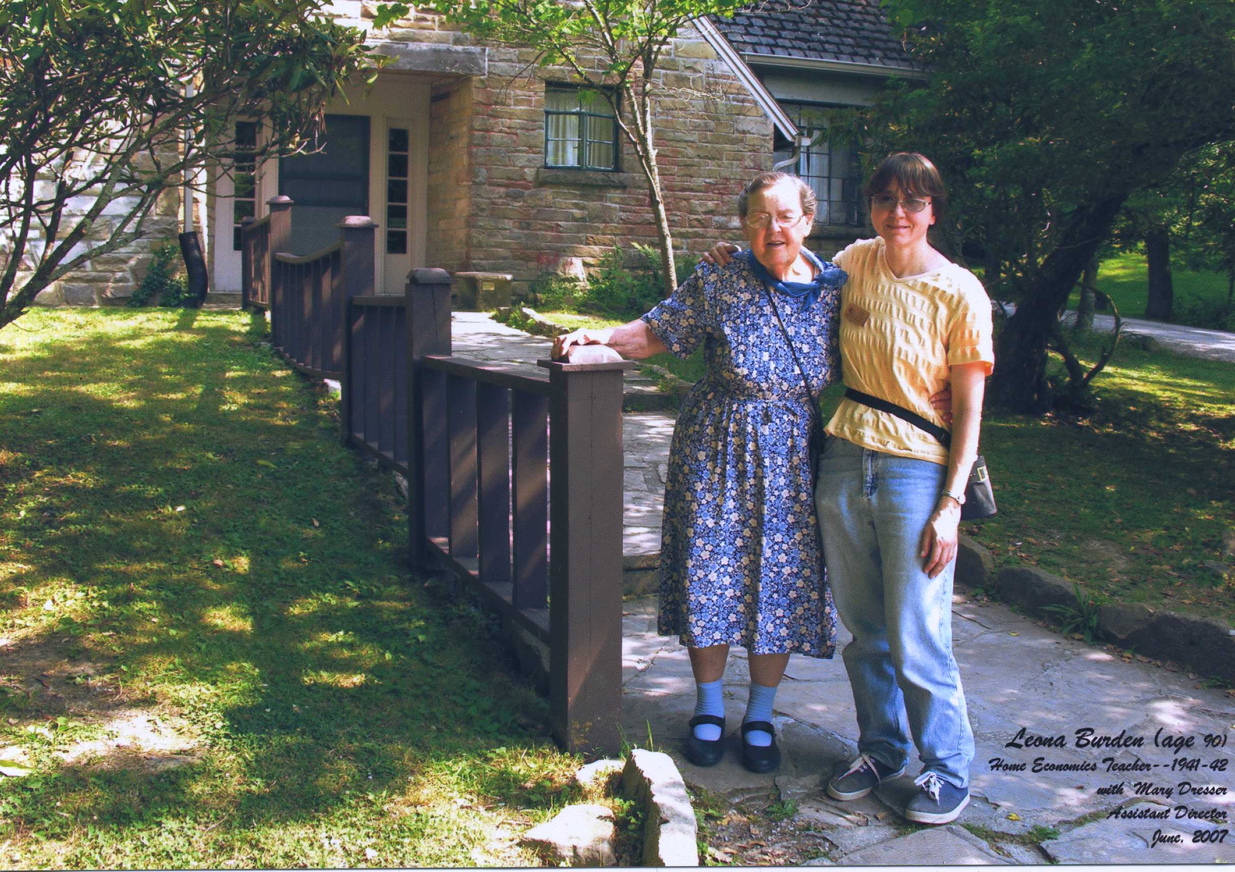 Leona and Jess Burden were teachers at Pine Mountain Settlement School during the school year of 1941-1942. When Leona P. Burden came back to Pine Mountain in June of 2007 for the first time since those early years, she was 90 years old. Her daughter, Shirley McLaughlin brought her back to the campus where she had the opportunity to see all the changes that had taken place through the years. At the time of her visit, she was in a retirement home in Portland, Oregon.
