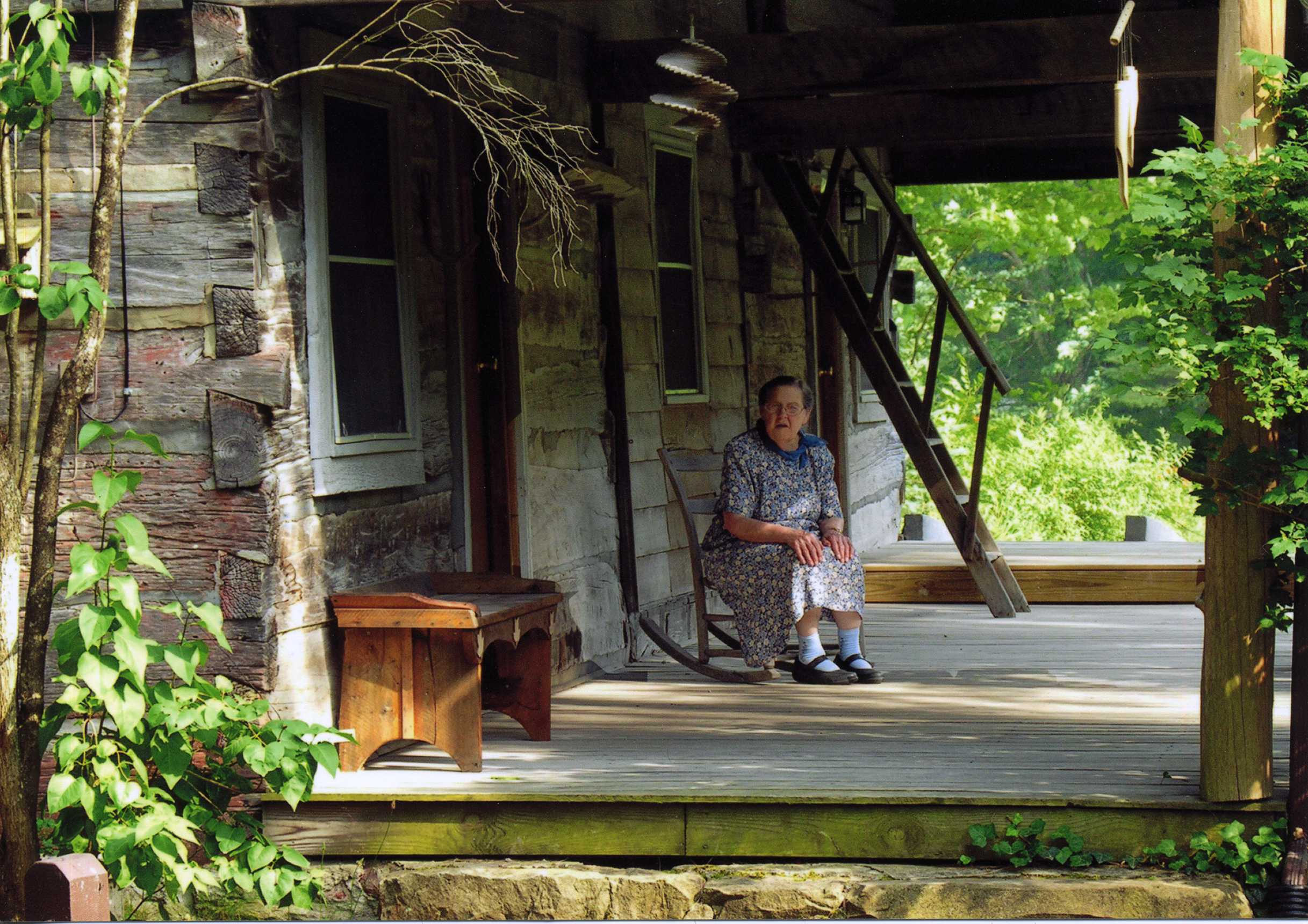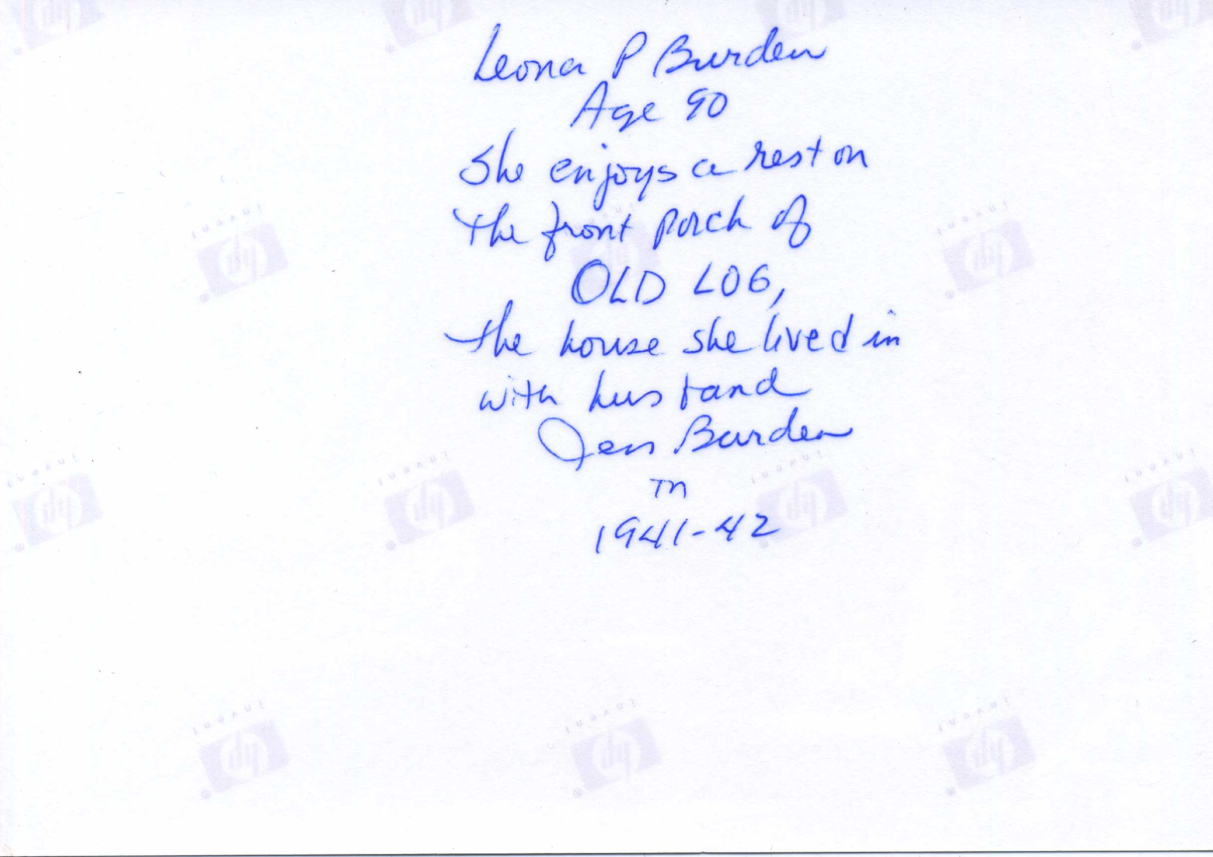 - Leona P. Burden sitting on the porch of Old Log where she and her husband Jess Burden lived while teaching at PMSS in 1941-1942. [burden_leona_007.jpg]