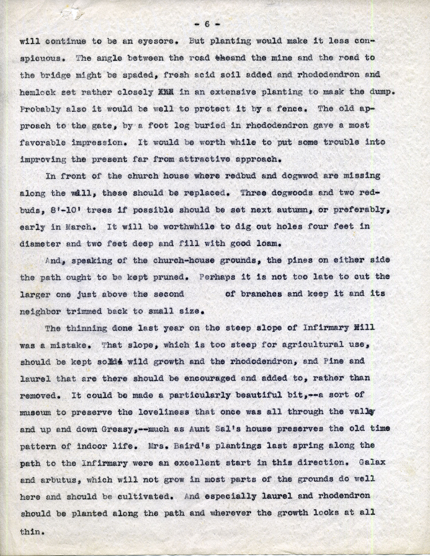 The thinning done last year on the steep slope of Infirmary Hill was a mistake. That slope, which is too steep for agricultural use, should be kept solid wild growth and the rhododendron, and pine and laurel that are there should be encouraged and added to, rather than removed. It could be made a particularly beautiful bit,—a sort of museum to preserve the loveliness that once was all through the valley and up and down Greasy,—much as Aunt Sal’s house preserves the old time pattern of indoor life. Mrs. [Lexine] Baird’s plantings last spring along the path to the Infirmary were an excellent start In this direction. Galax and arbutus, which will not grow in most parts of the grounds do well here and should be cultivated. And especially laurel and rhododendron should be planted along the path and wherever the growth looks at all thin.