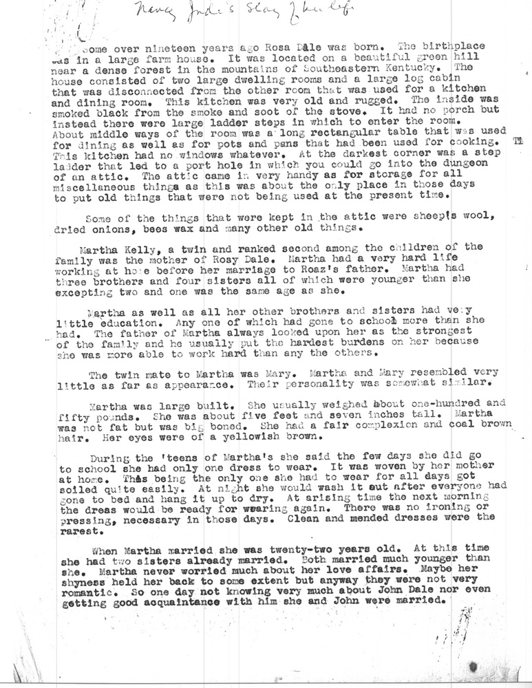 Some over nineteen years ago Rosa Dale was born. The birthplace was In a large farm house. It was located on a beautiful green hill near a dense forest in the mountains of Southeastern Kentucky. The house consisted of two large dwelling rooms and a large log cabin that was disconnected from the other room that was used for a kitchen and dining room. This kitchen was very old and rugged. The inside was smoked black from the smoke and soot of the stove. It had no porch but instead there were large ladder steps in which to enter the room. About middle ways of the room was a long rectangular table that was used for dining as well as for pots and pans that had been used for cooking. This kitchen had no windows whatever. At the darkest corner was a step ladder that led to a port hole in which you could go into the dungeon of an attic. The attic came in very handy as for storage for all miscellaneous things as this was about the only place in those days to put old things that were not being used at the present time.