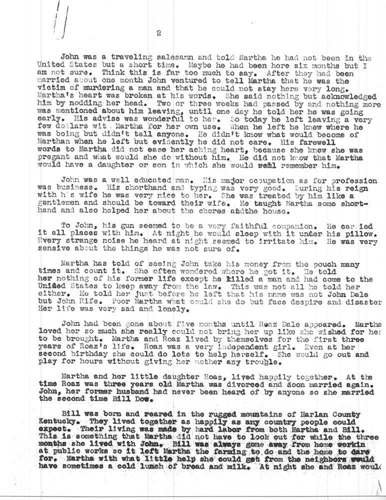 Martha has told of seeing John take his money from the pouch many times and count It. She often wondered where he got It. He told her nothing of his former life except he killed a man and had come to the United States to keep away from the law. This was not all he told her either. He told her just before he left that his name was not John Dale but John Rife. Poor Martha, what could she do but face despair and disaster. Her life was very sad and lonely.