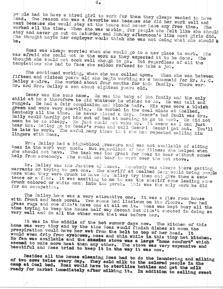 …people had to have a hired girl to work for them they always wanted to have Roaz. One reason she was a favorite was because she did her work well and next because she would stay at the house and never have any free time. She worked all the time.  When she was working for people she felt like she should stay and never go out on Saturday and Sunday afternoons like most girls did. She thought maybe her employer would think she was not doing what she should be.