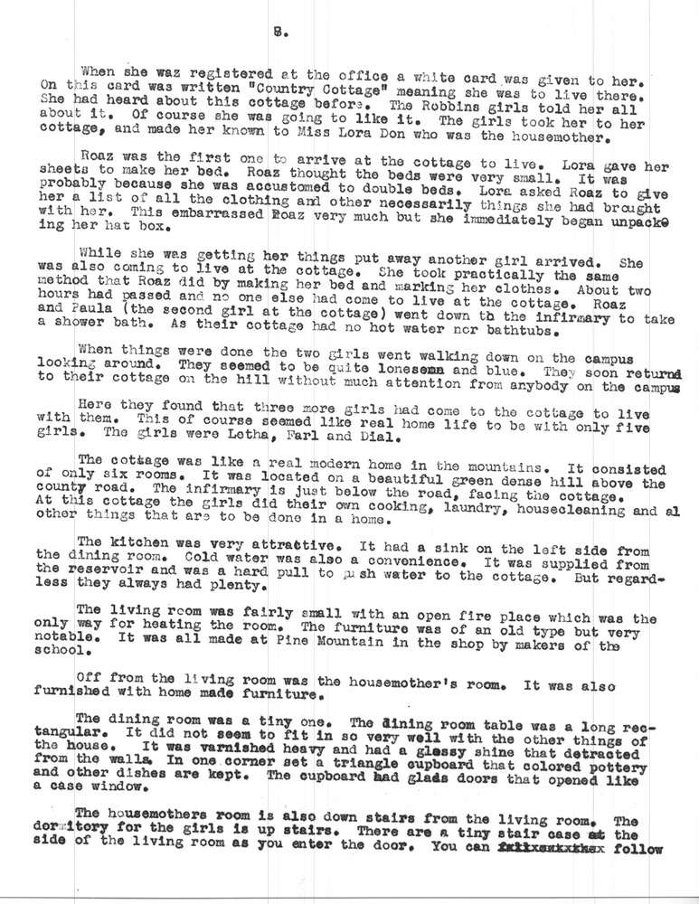 Two Robbins girls from Roaz’s neighborhood had gone to school at Pine Mountain Settlement School. They had told Roaz about it and she was becoming interesting (sic) in trying to get a place to go to Pine Mountain. She soon wrote to the Director, telling about the financial part and her wanting to come to Pine Mountain to try school for a while. She realized she was getting only two dollars a week for her work and she wondered how she could go to school and buy clothes in order to get started when school opened the first of September. She had only one month left now to do what she was going to [do].