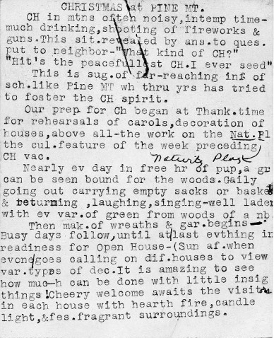 TAGS: Margaret Motter talk, Christmas at Pine Mountain, mountain Christmases, fostering the Christmas spirit, singing of carols, Nativity Play, gathering greenery, making wreaths and laurel garlands, Open House, trimming Christmas trees, medieval costumes, reading of scripture, Laurel House, Yule log, mummers play, Father Christmas, Christmas Week, old English culture