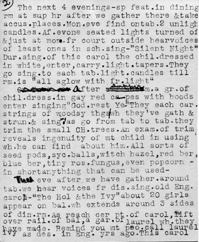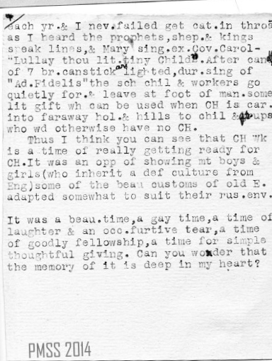 [page 4]…each year and I never failed to get a catch in my throat as I heard the prophets, shepherds, and kings speak lines, and Mary sing [ex.?] the Coventry Carol – “Lullay thou little tiny Child.” After the candles of seven [br.?] candlesticks are lighted during the singing of “Adeste Fideles,” the school children and workers go quietly forward and leave at the foot of the manger some little gift which can be used when Christmas is carried into the faraway hollers and hills to children and grownups who would otherwise have no Christmas.