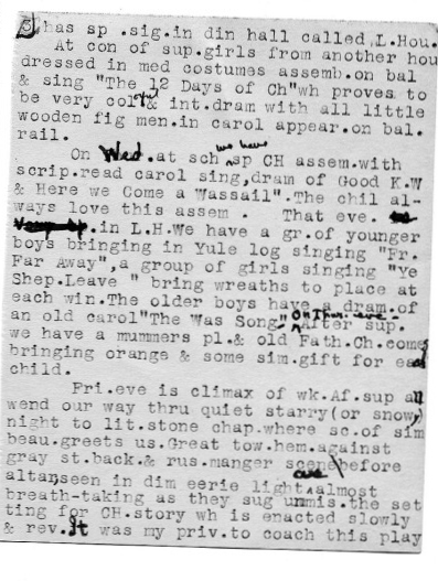 Tuesday evening, after we have gathered around the table, we hear voices from the distance singing the old English carol, “The Holly and the Ivy.” About 20 girls appear on the balcony which extends around three sides of the dining room. As they reach a certain point of the carol, they lit over the railing of the balcony a garland of laurel which they have made. May I remind you that mountain people call laurel, “ivy,” as described in England years ago. This carol…