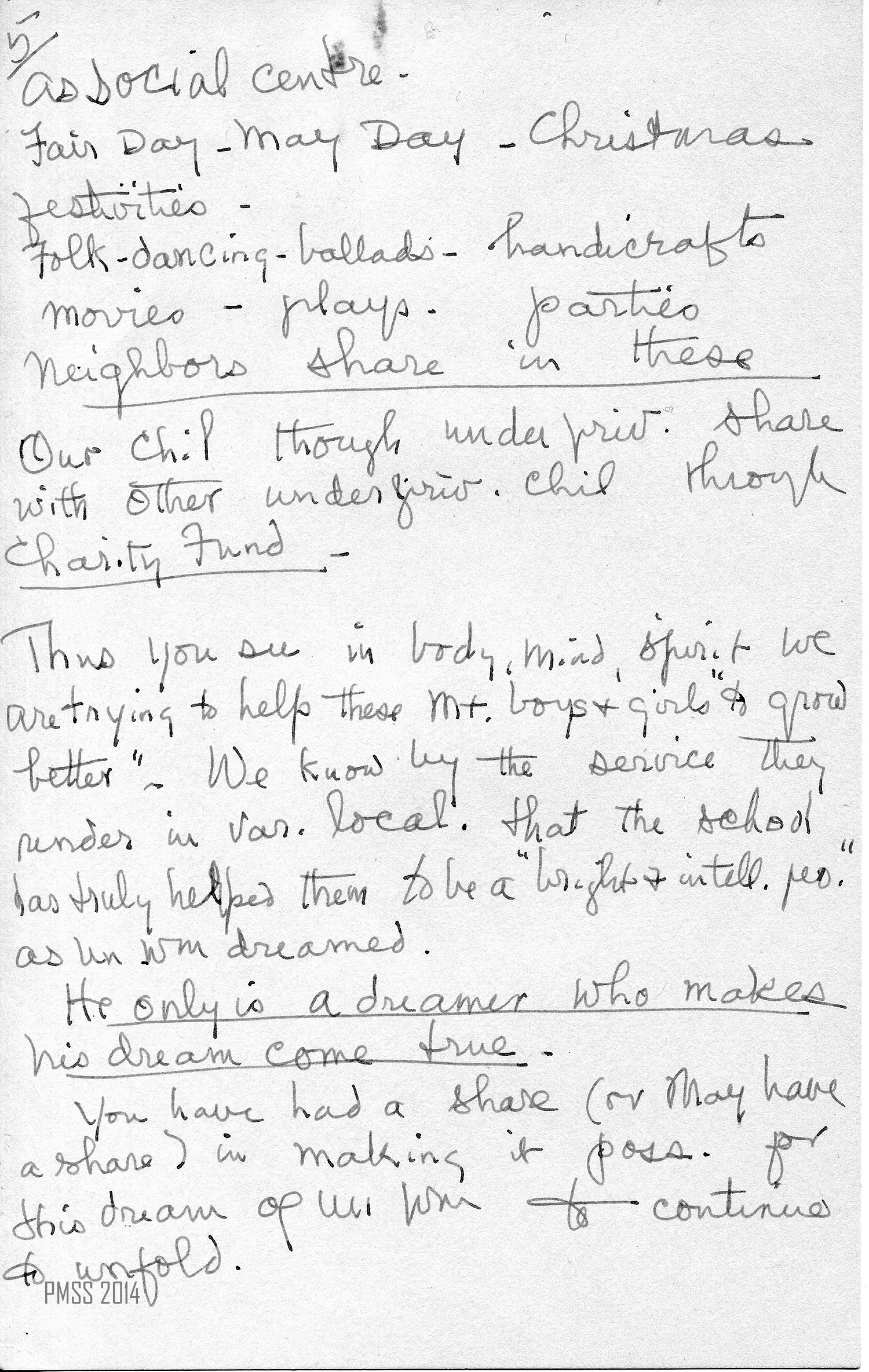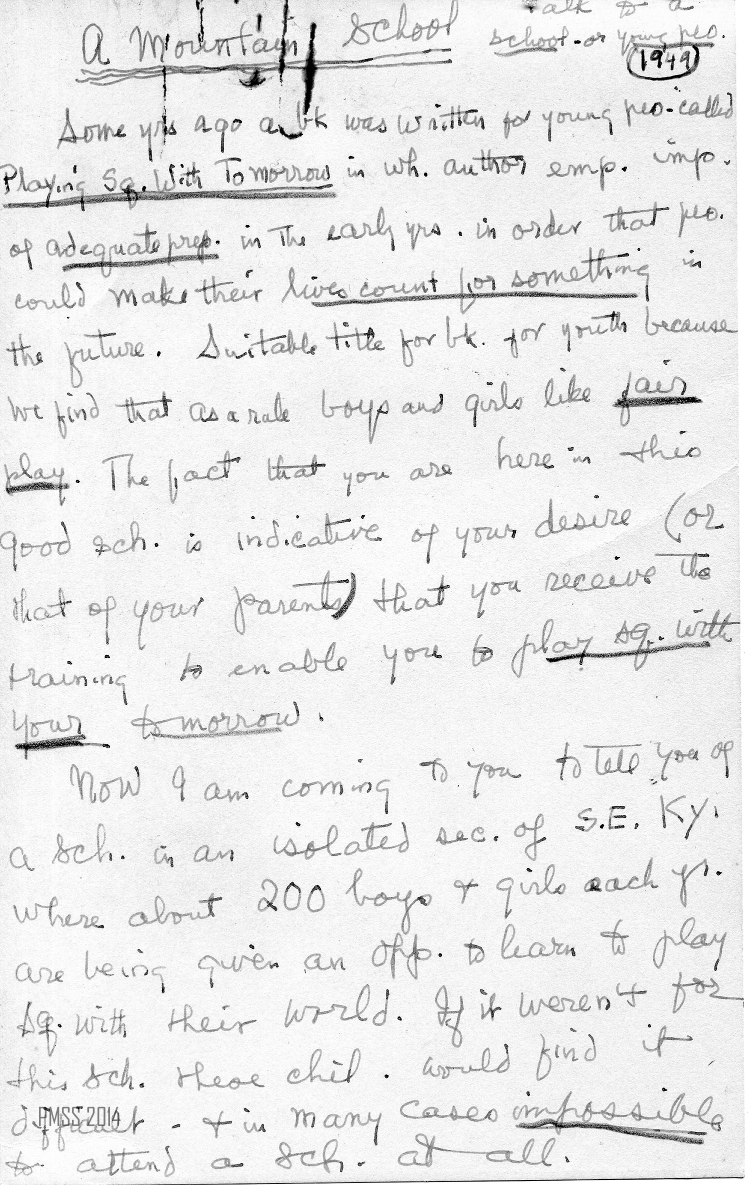 The following talk by Margaret Motter describes the School in 1949 and was used on a promotional virtual tour of the School. The talk is written out in long-hand with her typical abbreviations and is an overview of Pine Mountain Settlement School and its programs.