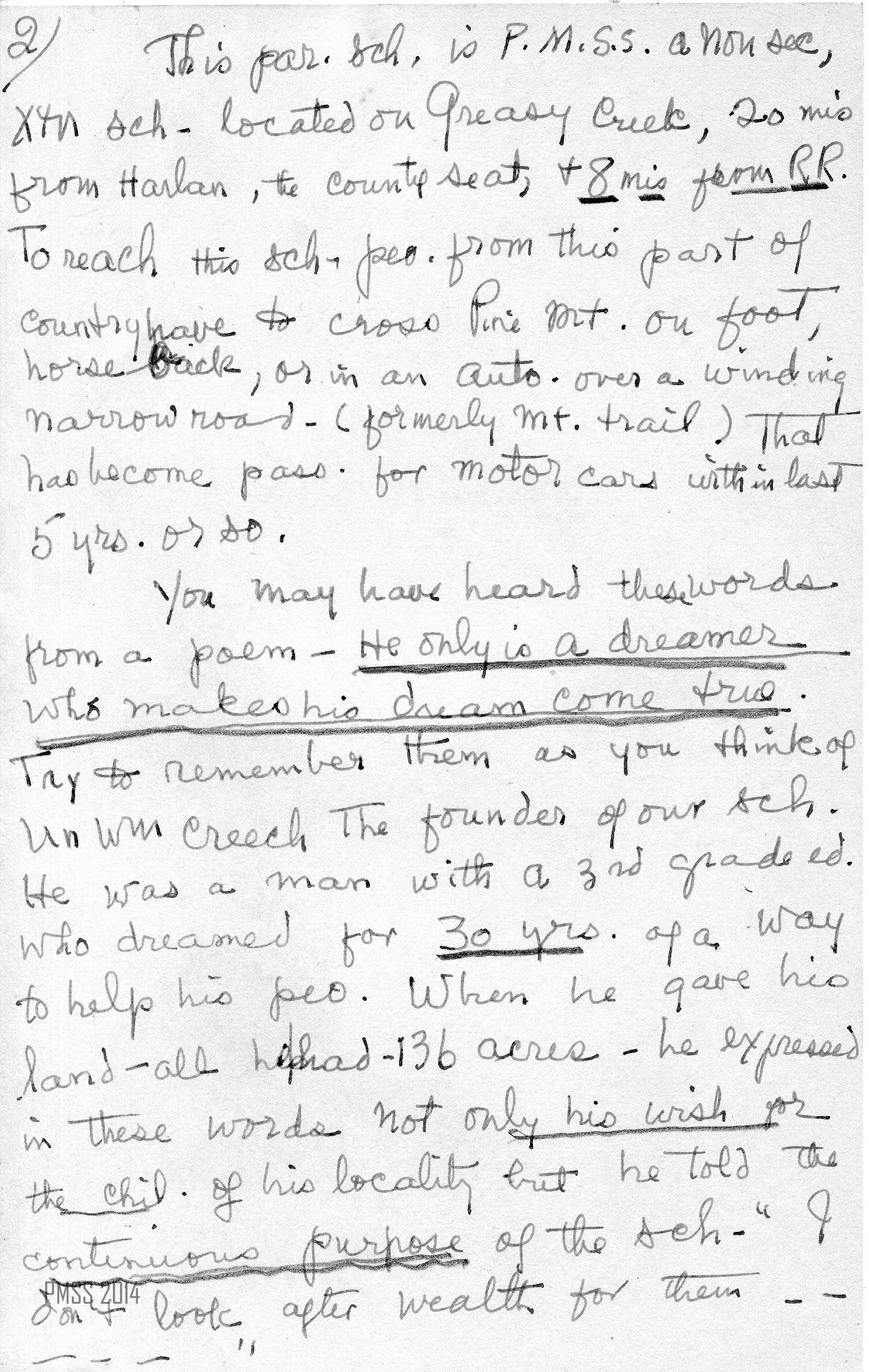 [page 2] This far School is Pine Mountain Settlement School, a non-sectarian [but] Christian school located on Greasy Creek, 20 miles from Harlan the county seat, and 8 miles from [the] railroad. To reach this School people from this part of the country have to cross Pine Mountain on foot, horseback, or in an auto, over a winding narrow road (formerly mountain trail) that has become passable for motor cars within the last 5 years or so.