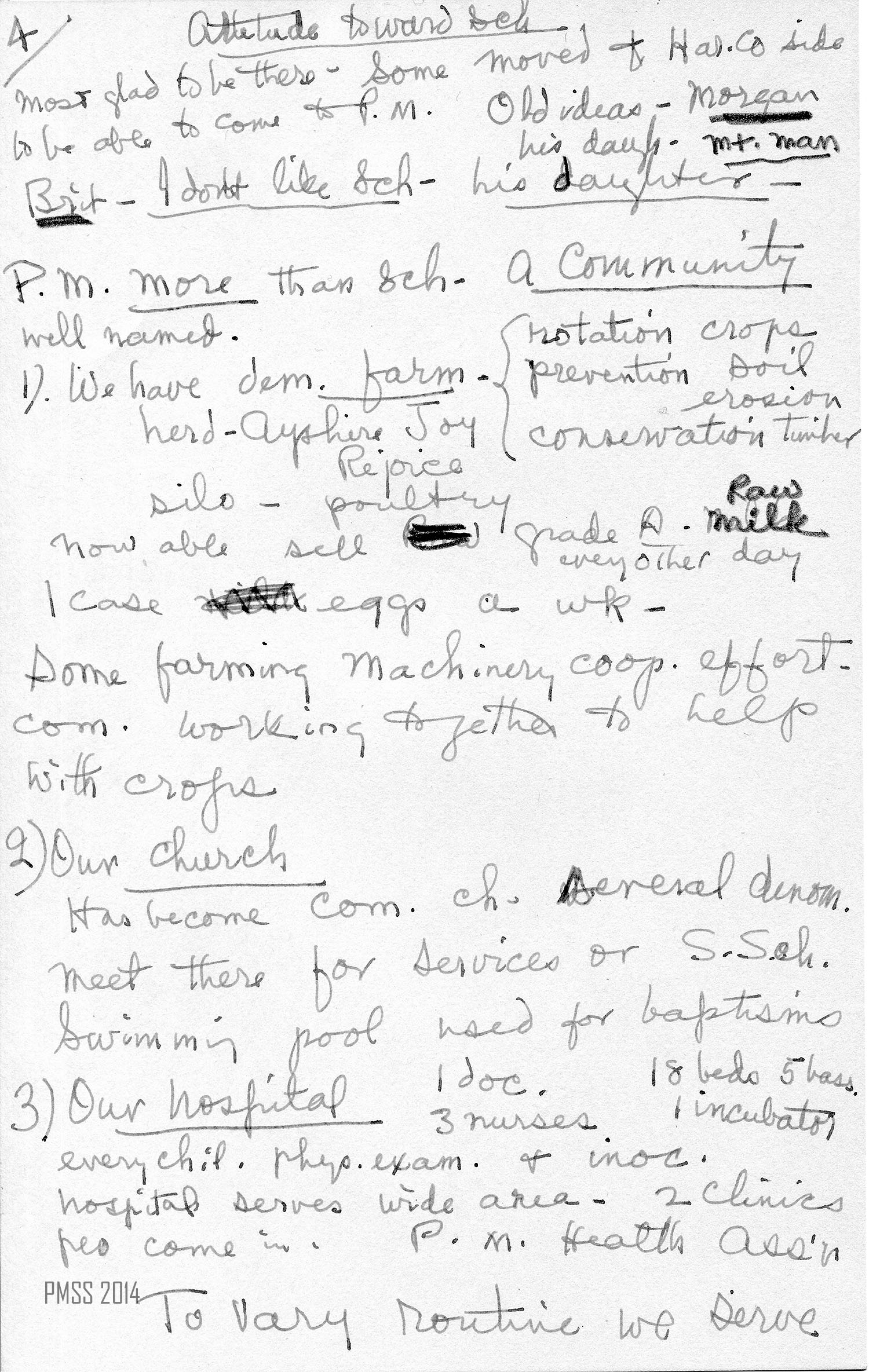 1.) We have a demonstration farm – rotation of crops, prevention of soil erosion; conservation of timber; herd of Ayrshire [cows] — Joy, Rejoice; silo; poultry. Now able to sell grade A raw milk every other day. 1 case of eggs a week. Some farming machinery is a cooperative effort; community working together to help with crops.