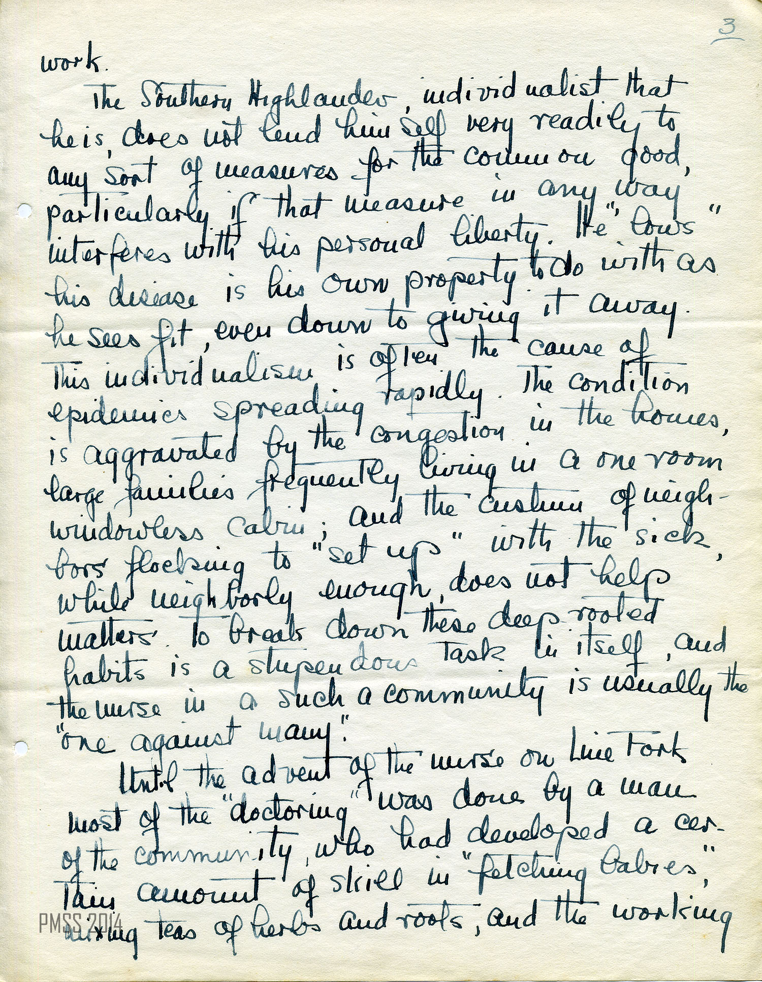 But the health work has seemingly progressed slowly. However, when working in a mountain country of rough roads, narrow valleys and high hills where primitive pioneer standards of living prevail, and superstition and suspicion hold sway, one must needs first spend much [time to undo] that and time in making friends and inspiring the confidence of the people. And, hand-in-hand with this is the need of anyone working with them to get to know everything possible about their historic background. Even with this much accomplished by the nurse, achievement along public health lines is strenuous up-hill work.