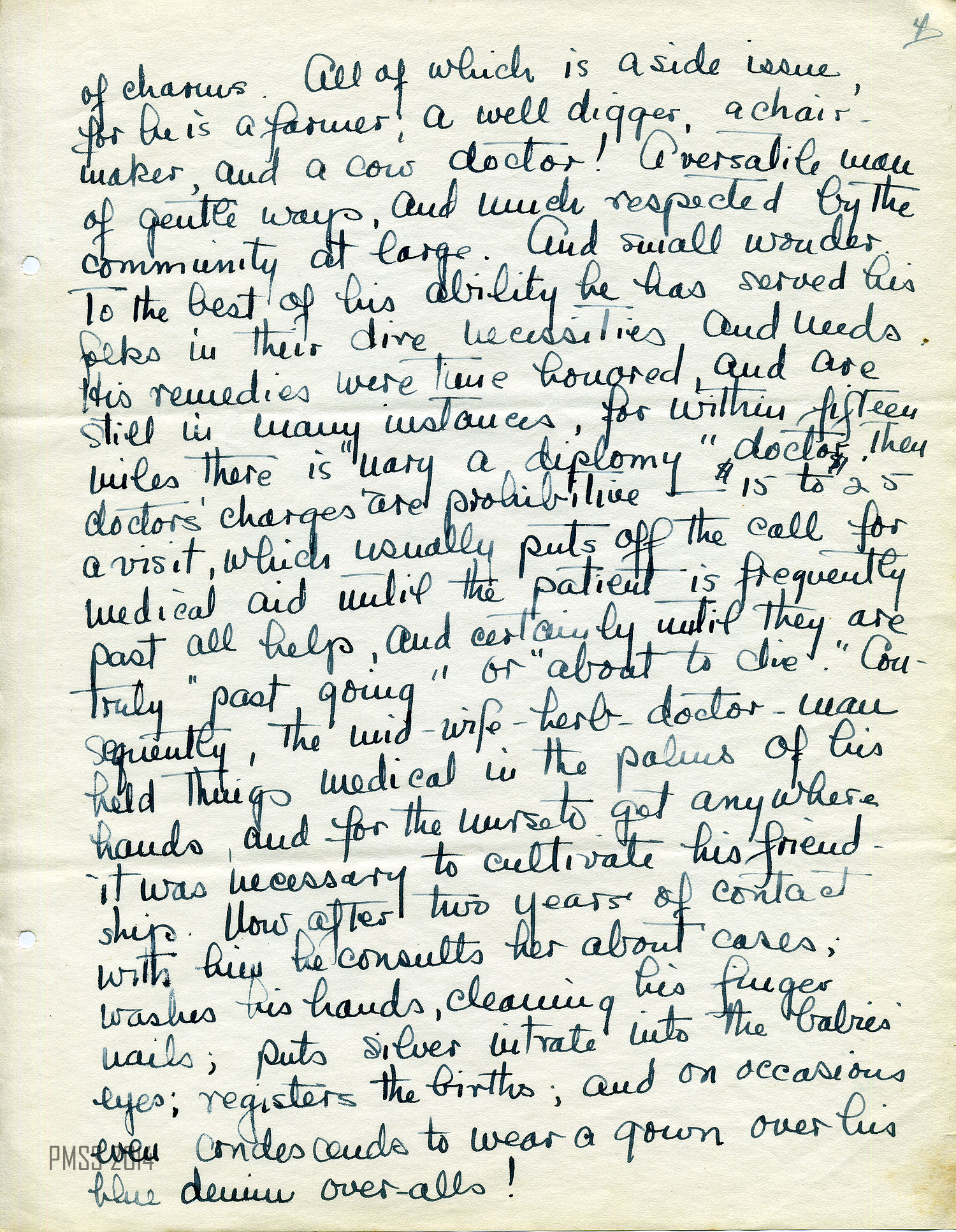 Until the advent of the nurse on Line Fork, most of the “doctoring” was done by a man of the community, who developed a certain amount of skill in “fetching babies,” mixing teas of herbs and roots, and the working of charms. All of which is a side issue, for he is a farmer, a well-digger, a chair maker, and a cow doctor! A versatile man of gentle ways, and much respected by the community at large. And small wonder. To the best of his ability, he has served his folks in their dire necessities and needs. His remedies were time-honored, and are still in many instances, for within fifteen miles there is “nary a diplomy” doctor. Then doctor’s charges are prohibitive — $15 to $25 a visit, which usually puts off the call for medical aid until the patient is frequently past all help, and certainly until they are truly “past going” or “about to die.” Consequently, the mid-wife-herb-doctor-man held things medical in the palms of his hands, and for the nurse to get anywhere it was necessary to cultivate his friendship. Now after two years of contact with him he consults her about cases; washes his hands, cleaning his fingernails; puts silver nitrate into the babies eyes; registers the births; and on occasions even condescends to wear a gown over his blue denim over-alls!