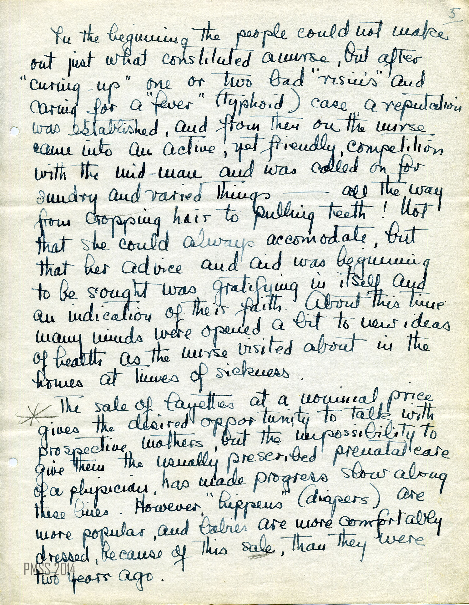 In the beginning the people could not make out just what constituted a nurse, but after “curing-up” one or two bad “visiees” and caring for a “fever” (typhoid) case, a reputation was established, and from then on the nurse came into an active, yet friendly, competition with the mid-man and was called on for sundry and varied things — all the way from cropping hair to pulling teeth! Not that she could always accommodate, but that her advice and aid was beginning to be sought was gratifying in itself and an indicator of their faith. About this time many minds were opened a bit to new ideas of health as the nurse visited about in the houses at times of sickness.