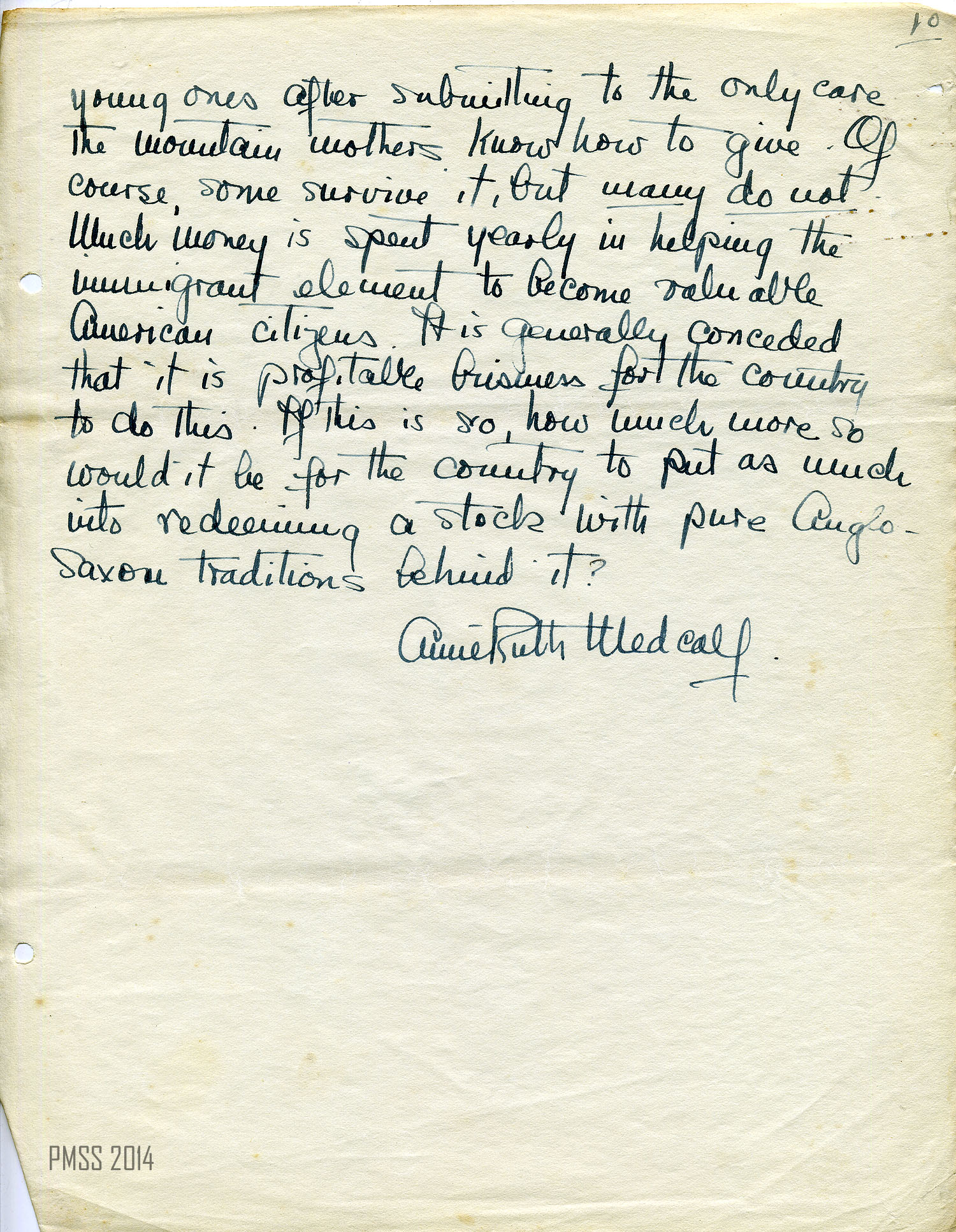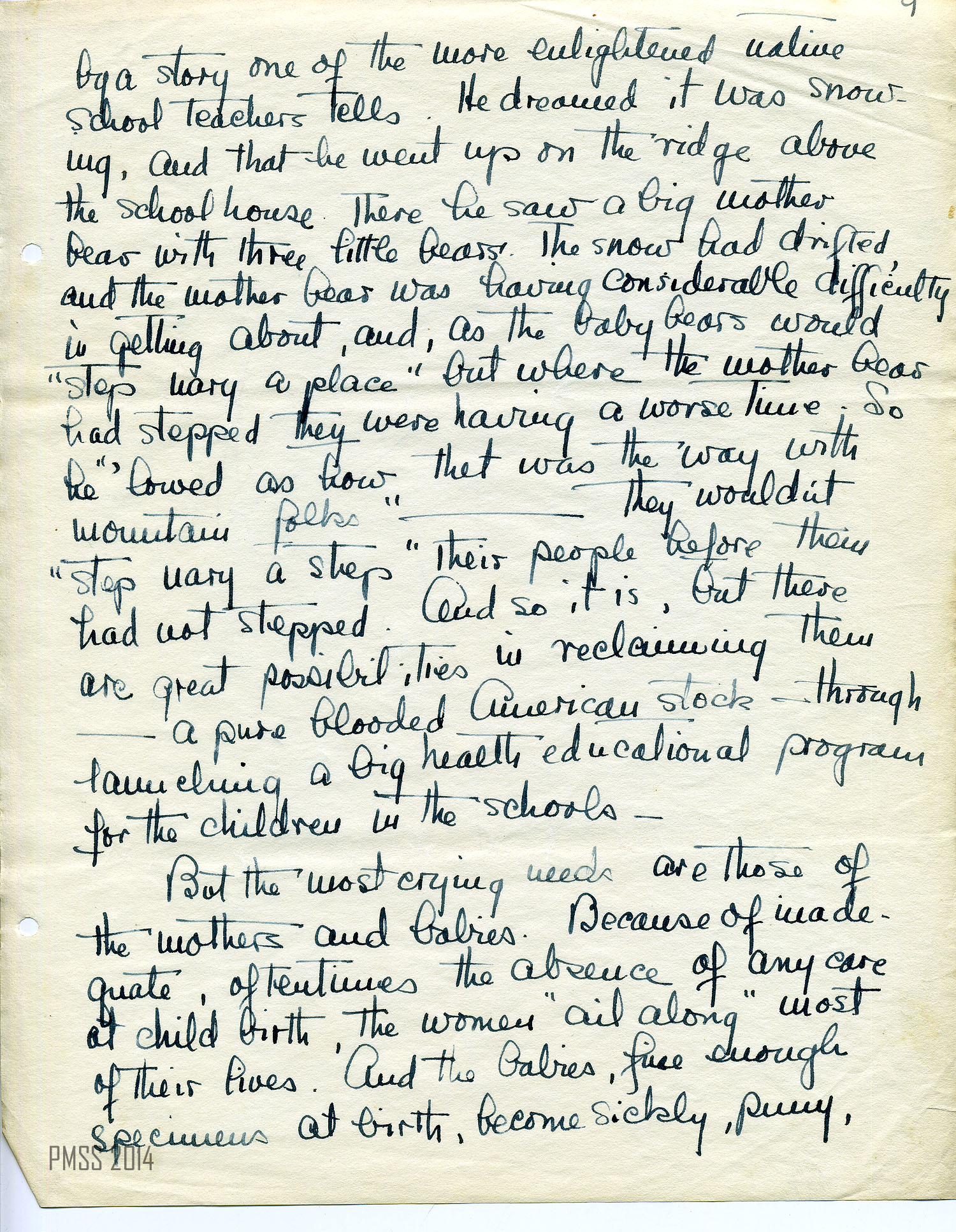 But the most crying need are those of the mothers and babies. Because of inadequate, often times the absence of any care at child-birth, the women “ail along” most of their lives. And the babies, fine enough specimens at birth, become sickly, puny, young ones after submitting to the only care the mountain mothers know how to give. Of course, some survive it, but many do not. Much money is spent yearly in helping the immigrant element to become valuable American citizens. It is generally conceded that it is profitable business for the country to do this. If this is so, how much more so would it be for the country to put as much into redeeming a stock with pure Anglo Saxon traditions behind it?