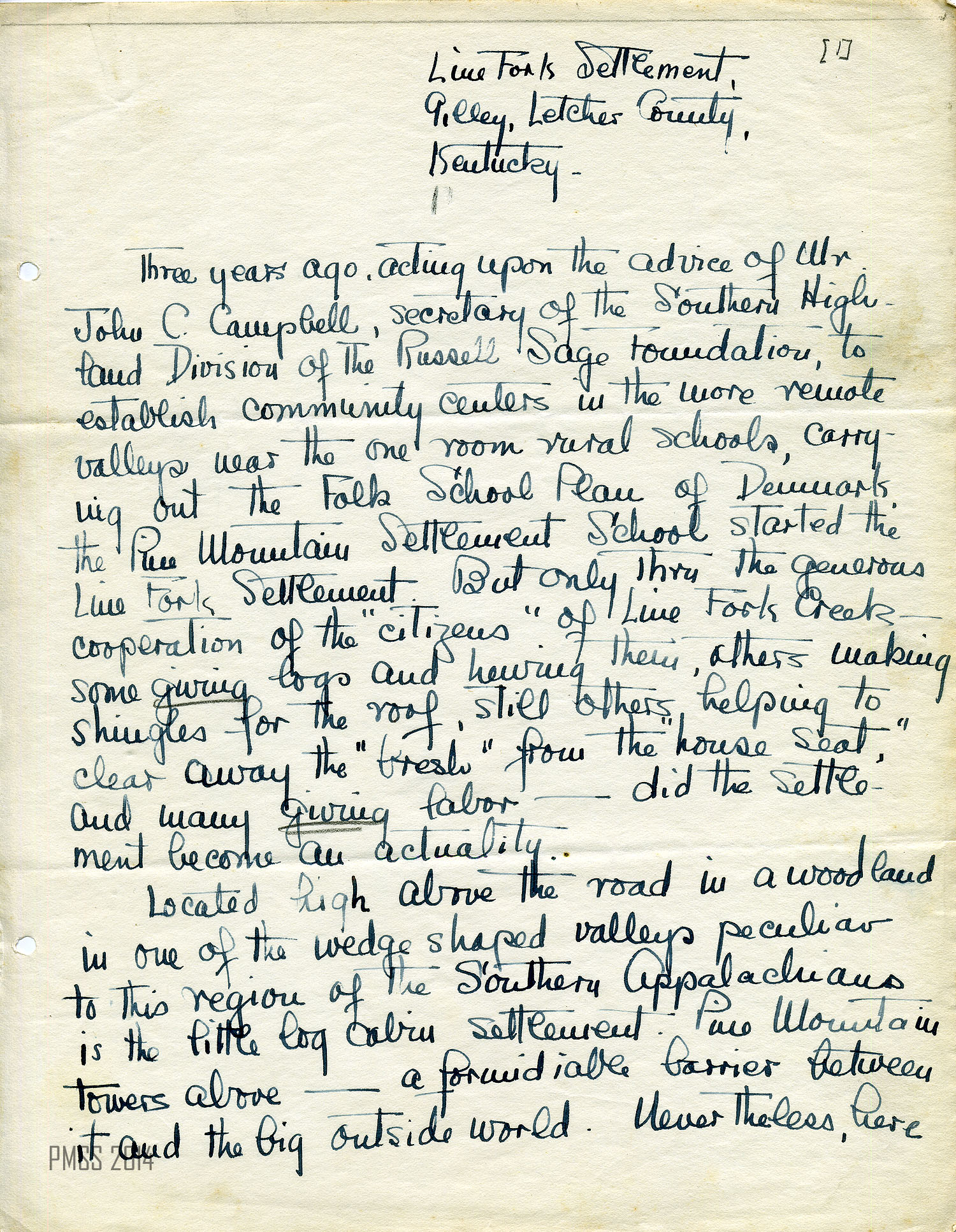 Three years ago, acting upon the advice of Mr. John C. Campbell, secretary of the Southern Highland Division of the Russell Sage Foundation to establish community centers in the more remote valleys near the one-room rural schools, carrying out the Folk School Plan of Denmark, the Pine Mountain Settlement School started the Line Fork Settlement. But only thru the generous cooperation of the “citizens” of Line Fork creek — some giving logs and hewing the logs, others making shingles for the roof, still others helping to clear away the “bresh” from the “house seat,” and many giving labor — did the settlement become an actuality.