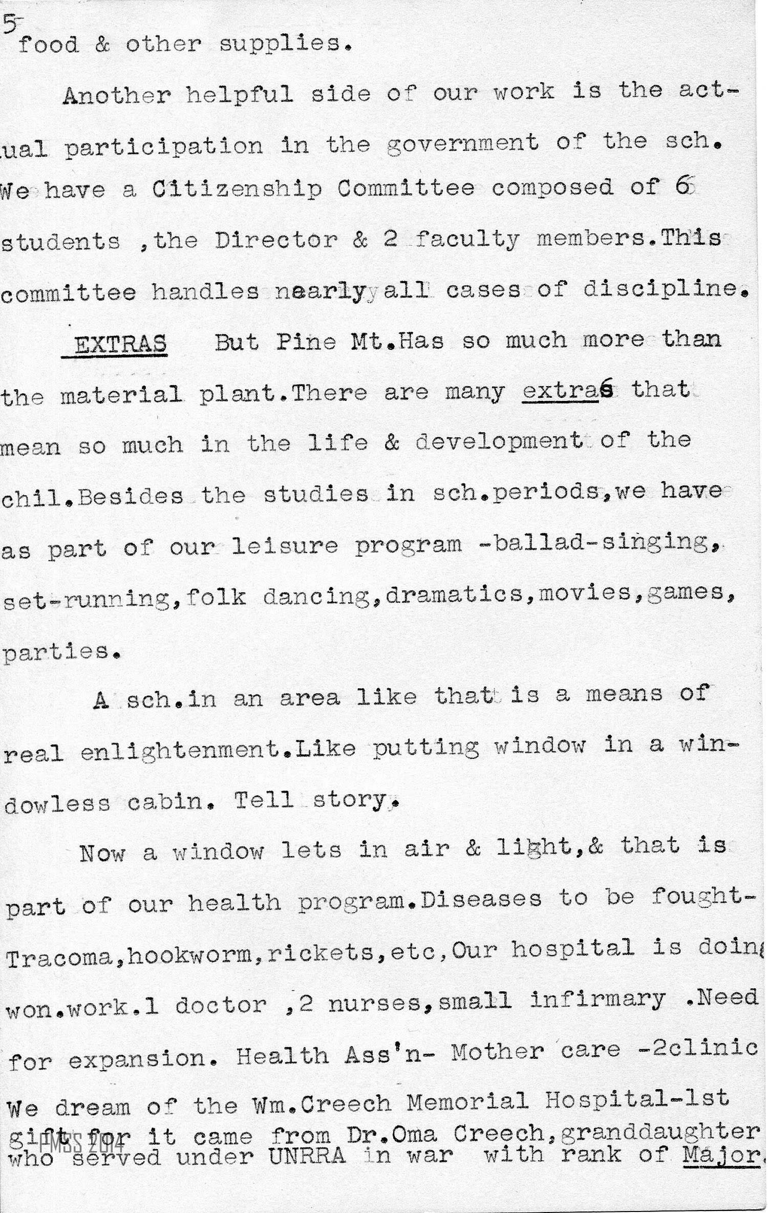 We dream of the William Creech Memorial Hospital — 1st gift for it came from Dr. Oma Creech, grand daughter [of Uncle William] who served under UNRRA in war with the rank of Major.