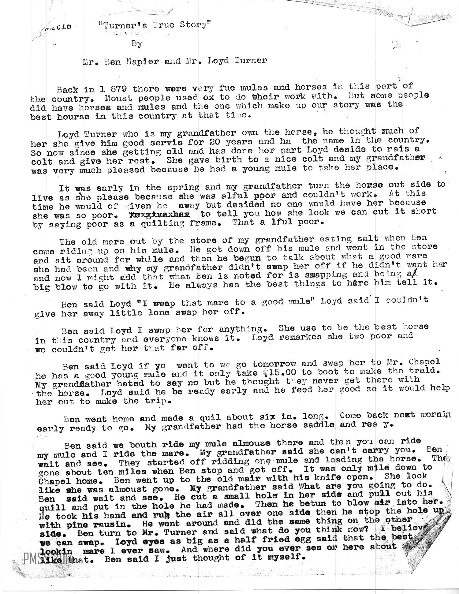 Chapel had planned to go to town next day and show what a fine horse he had bought. He had his son up early to go feed his mare and water her. They feed her all she could eat that night. She ate too much so the boy put the bridle on her and led her up to a rock and got on her to take to water. He rode down to the creek and she rode like a feather bed. The mare stoop over to get a drink and one side broke loose, the air begin to come out and one whole side of the mare went down. The boy tried to get off but couldn’t because the horse begin to go sideways because she was on balance. The other side puff out like [a] frog. The boy ran to tell his father he was so scared that he didn’t know what had happen. His father jump up out of bed in his [….?] and run to see what had happen. It scared him at first. But he took two more thoughts and went up and look closely, then he went on other side of the mare and open up a hole and let out the air. What did Chapel see then — nothing but a quilting frame. The old mare fell over and died. Chapel was so mad that he come to get his mule, but Ben said, I wanted to trade back with you and you wouldn’t, so I’ve traded again now and you lost this time.