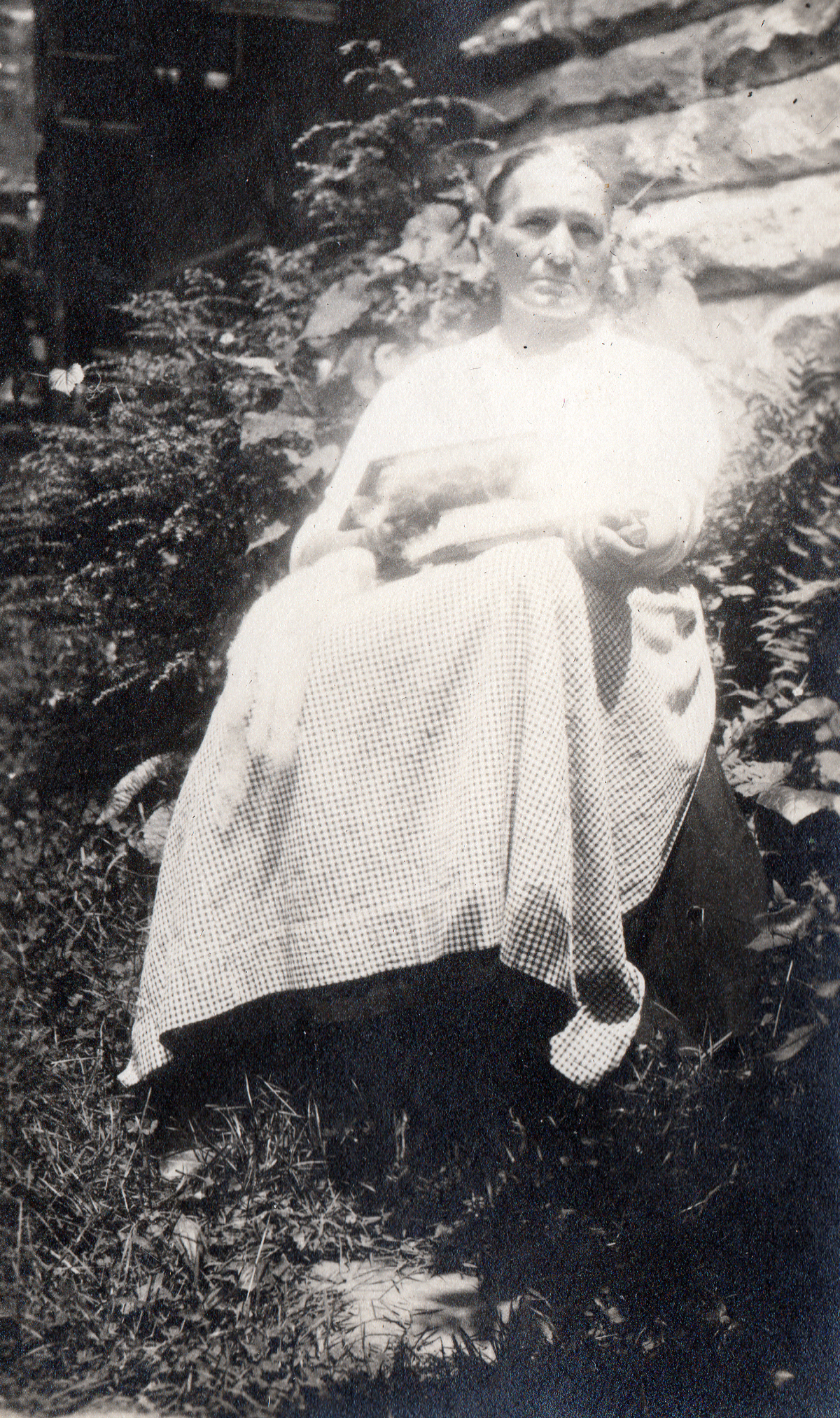 - Maya Sudo Album: Harriet Butler standing beside cabin with flowers. Big Laurel Cabin (?). [sudo_album_036c_mod.jpg]