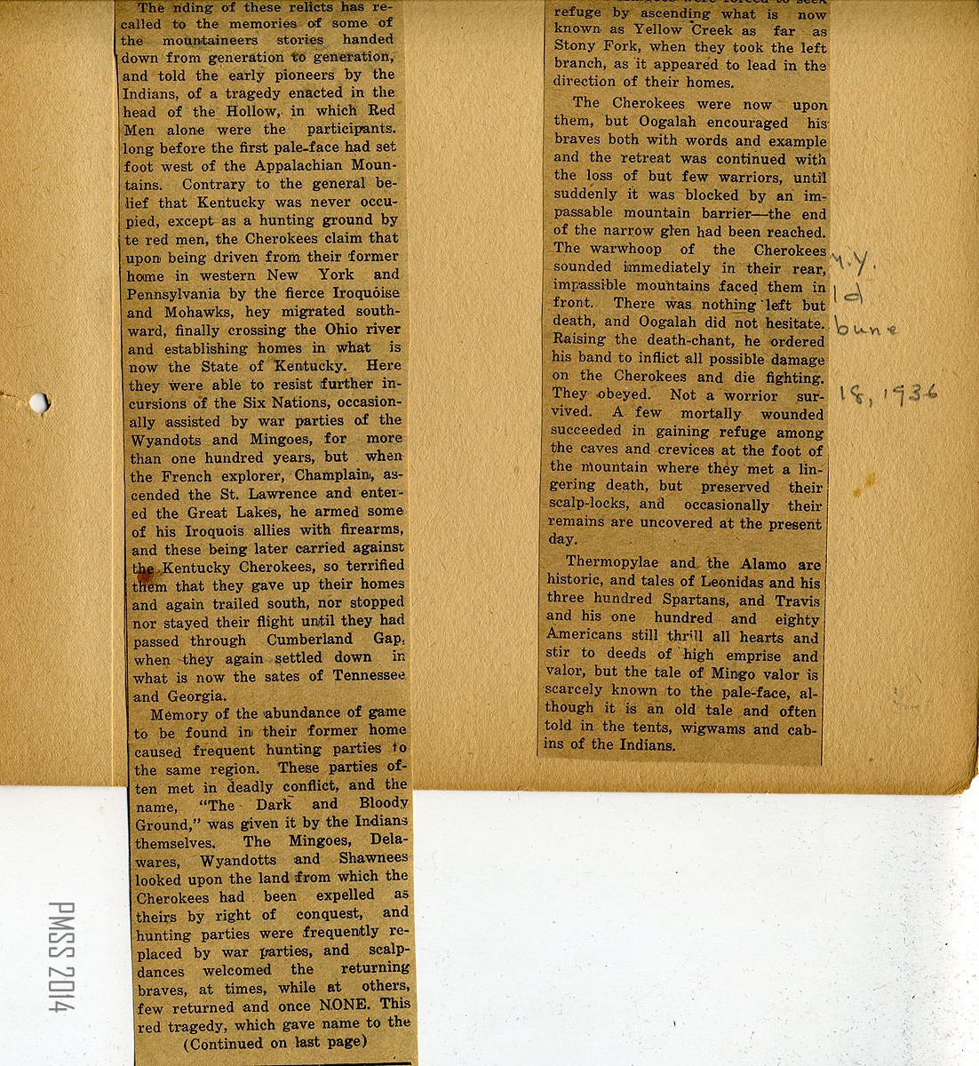 “Indian Tragedy in Mingo Hollow. Interesting Story of How Famous Hollow Got Its Name.” Mingo Hollow, Jan. 26, 1921. Source unknown. Discusses: Mingoes ; Cherokee ; Mingo Hollow ; Yellow Creek ; Oogalah, Eagle of the Mingoes ; Cumberland Gap ; Middlesboro ; Stony Fork ;