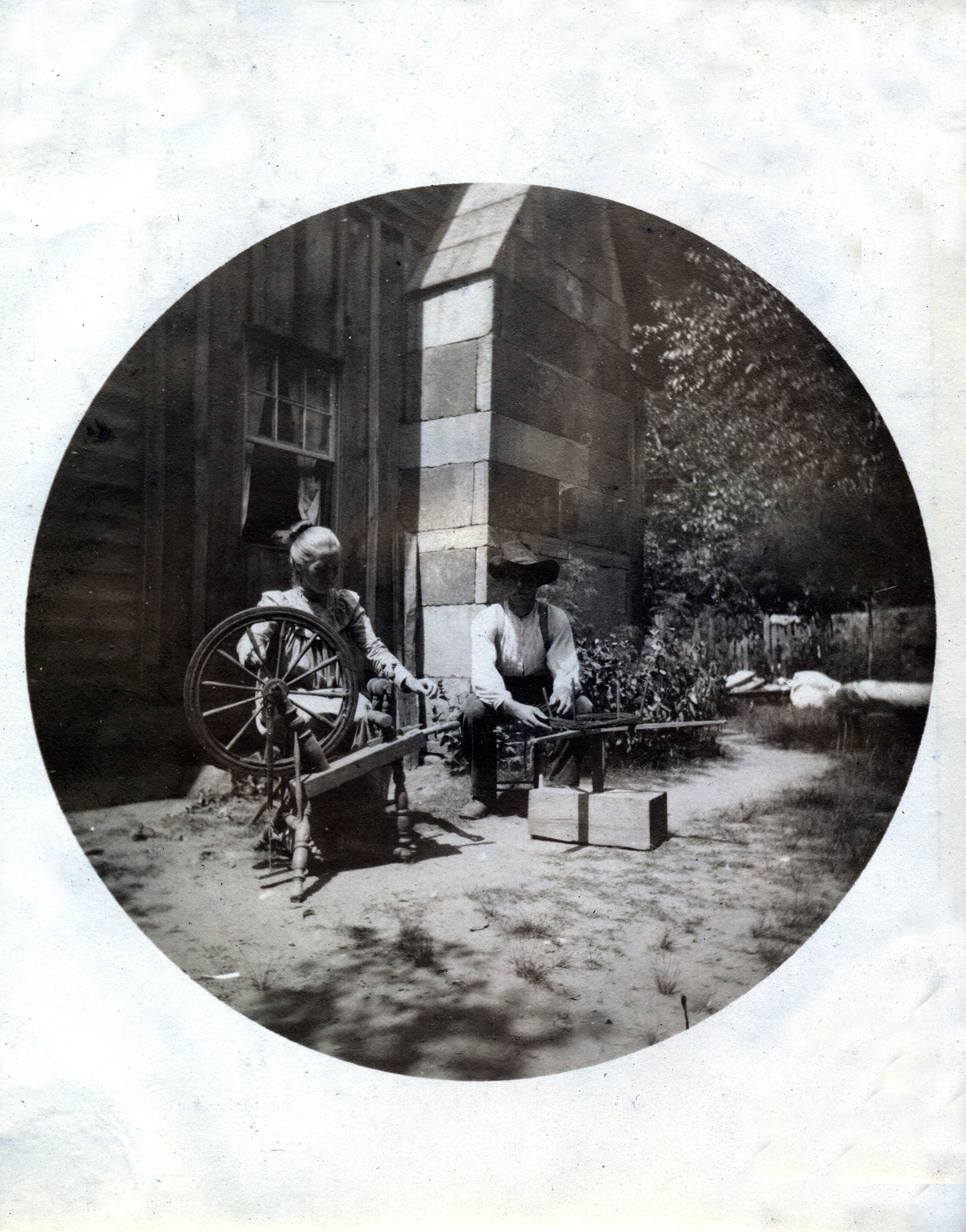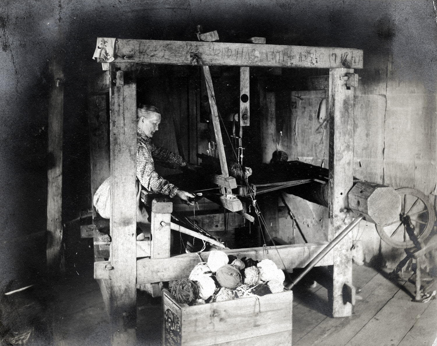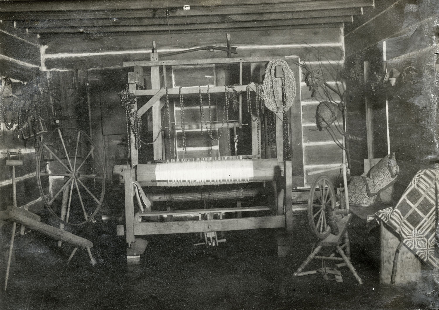 The life of the Combs family and their skills at weaving are captured in this small album of photographs belonging to Katherine Pettit which she titled “The Social Settlement in the Ky [Kentucky] Mountains 1901. Sassafras, Knott Co[unty].” The small and fragile album of 27 pages, held in the Pine Mountain archive, shows members of the Combs family and a young lady who was living with the Combs, shearing their sheep, washing the wool, drying the wool, picking and carding, dying the “hanks,” and finally spinning the wool to be placed on spindles. The images freeze this valuable pioneer processes in time and allow the viewer to understand the many complex tasks associated with the manufacture of textiles in the Southern Appalachians.