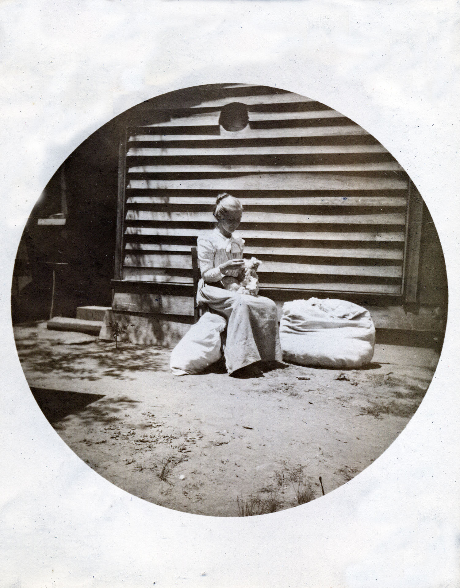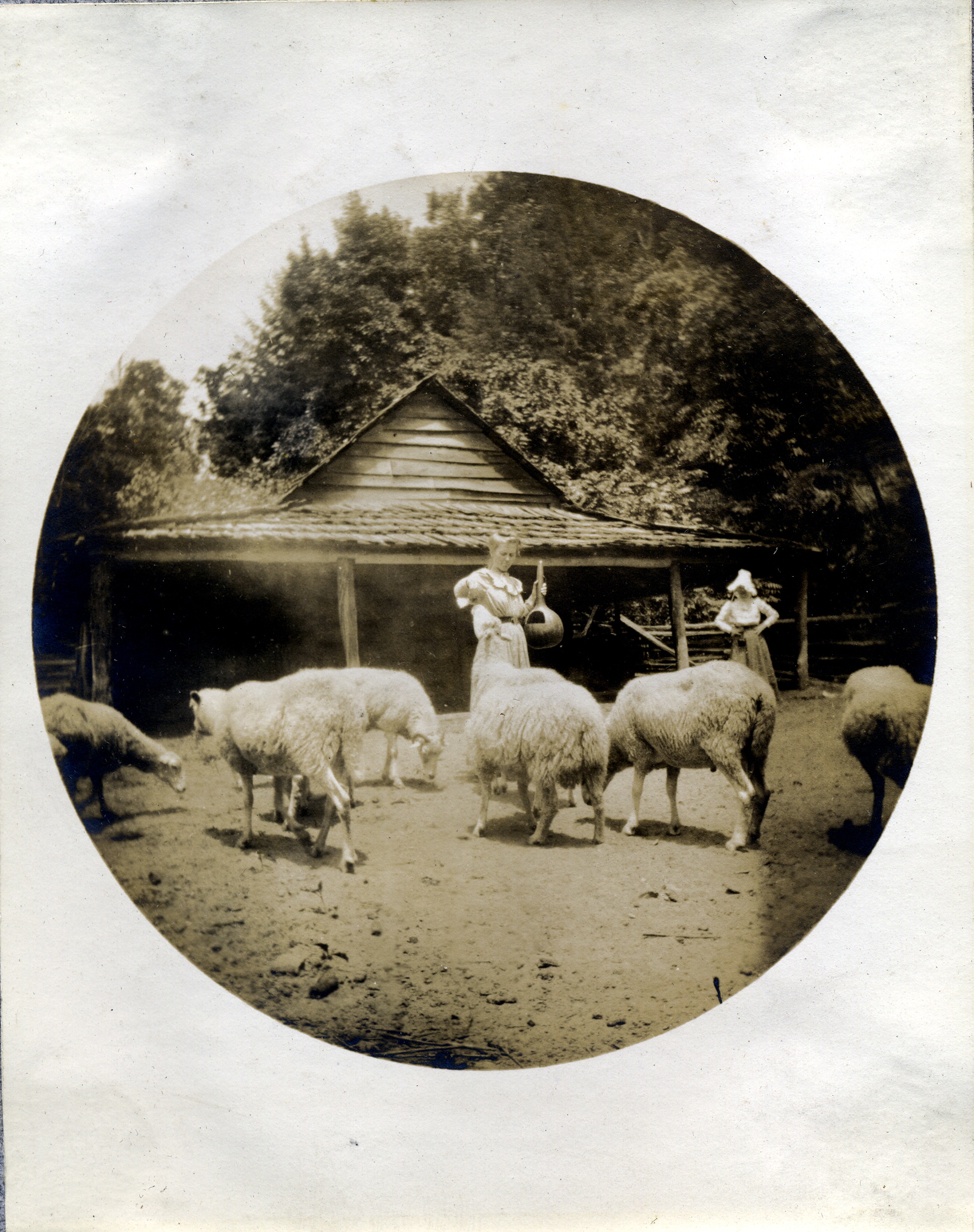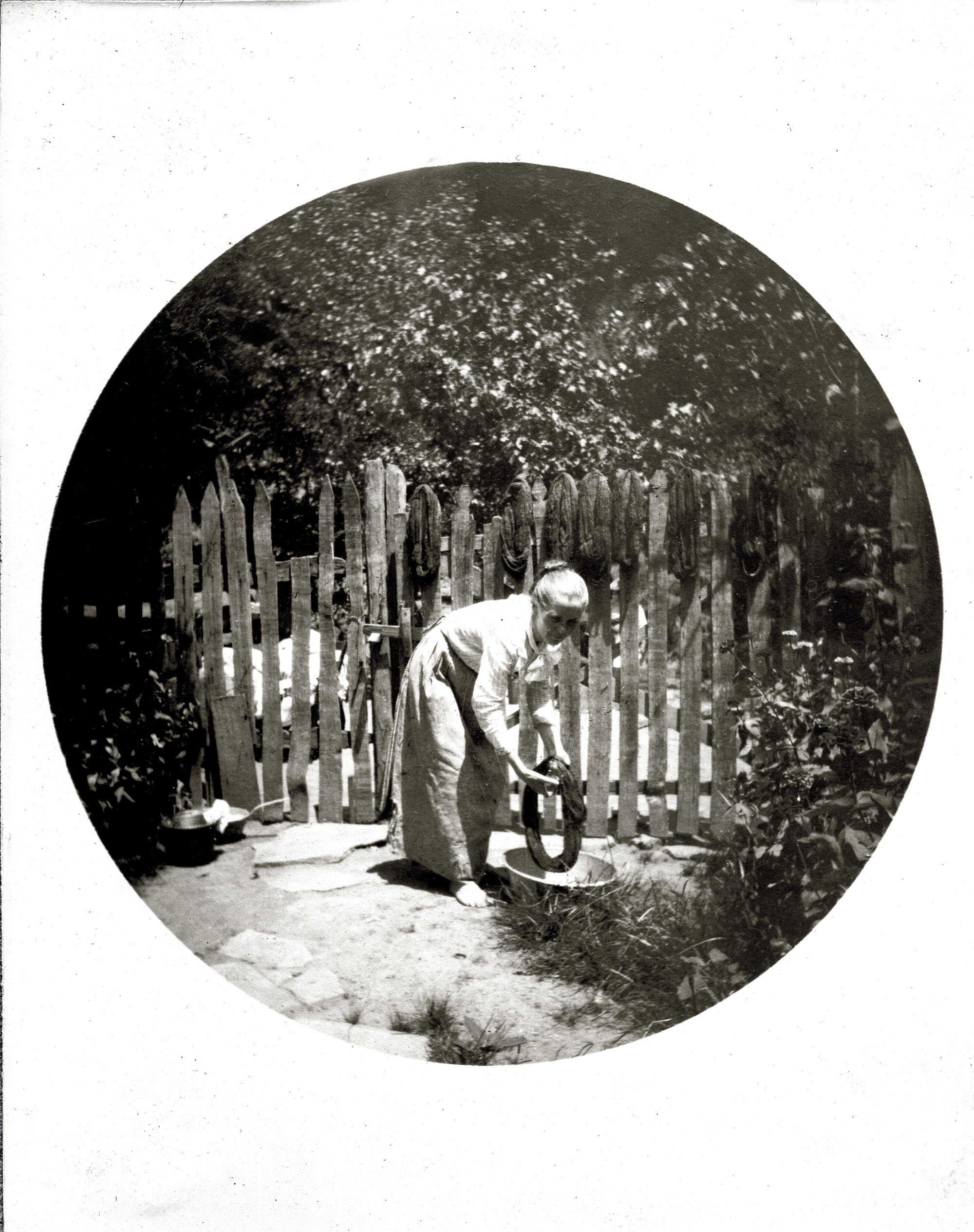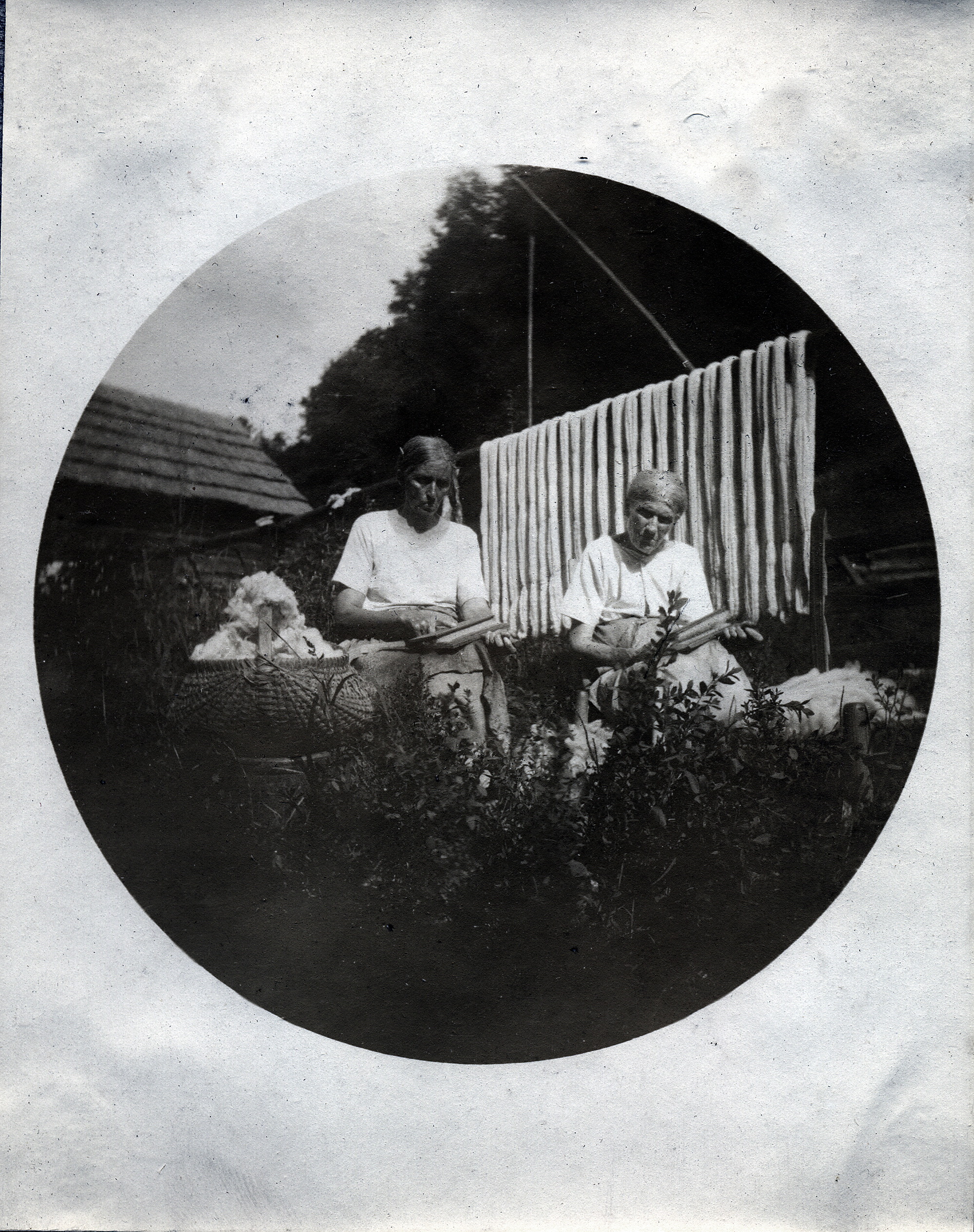 The life of the Combs family and their skills at weaving are captured in this small album of photographs belonging to Katherine Pettit which she titled “The Social Settlement in the Ky [Kentucky] Mountains 1901. Sassafras, Knott Co[unty].” The small and fragile album of 27 pages, held in the Pine Mountain archive, shows members of the Combs family and a young lady who was living with the Combs, shearing their sheep, washing the wool, drying the wool, picking and carding, dying the “hanks,” and finally spinning the wool to be placed on spindles. The images freeze this valuable pioneer processes in time and allow the viewer to understand the many complex tasks associated with the manufacture of textiles in the Southern Appalachians.