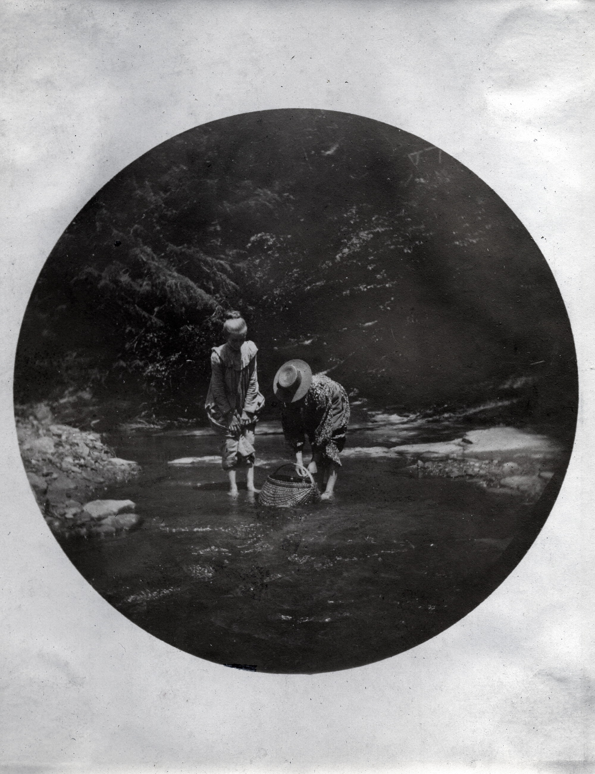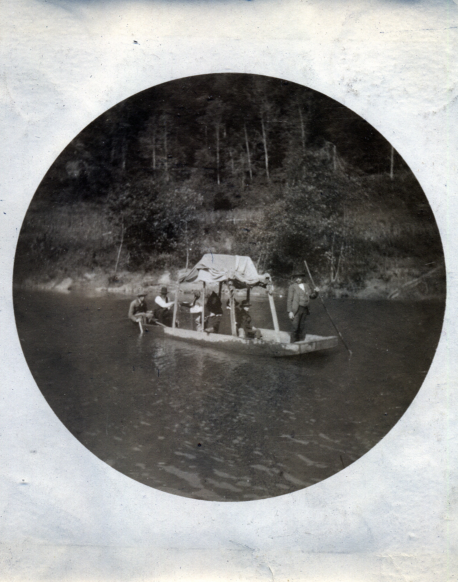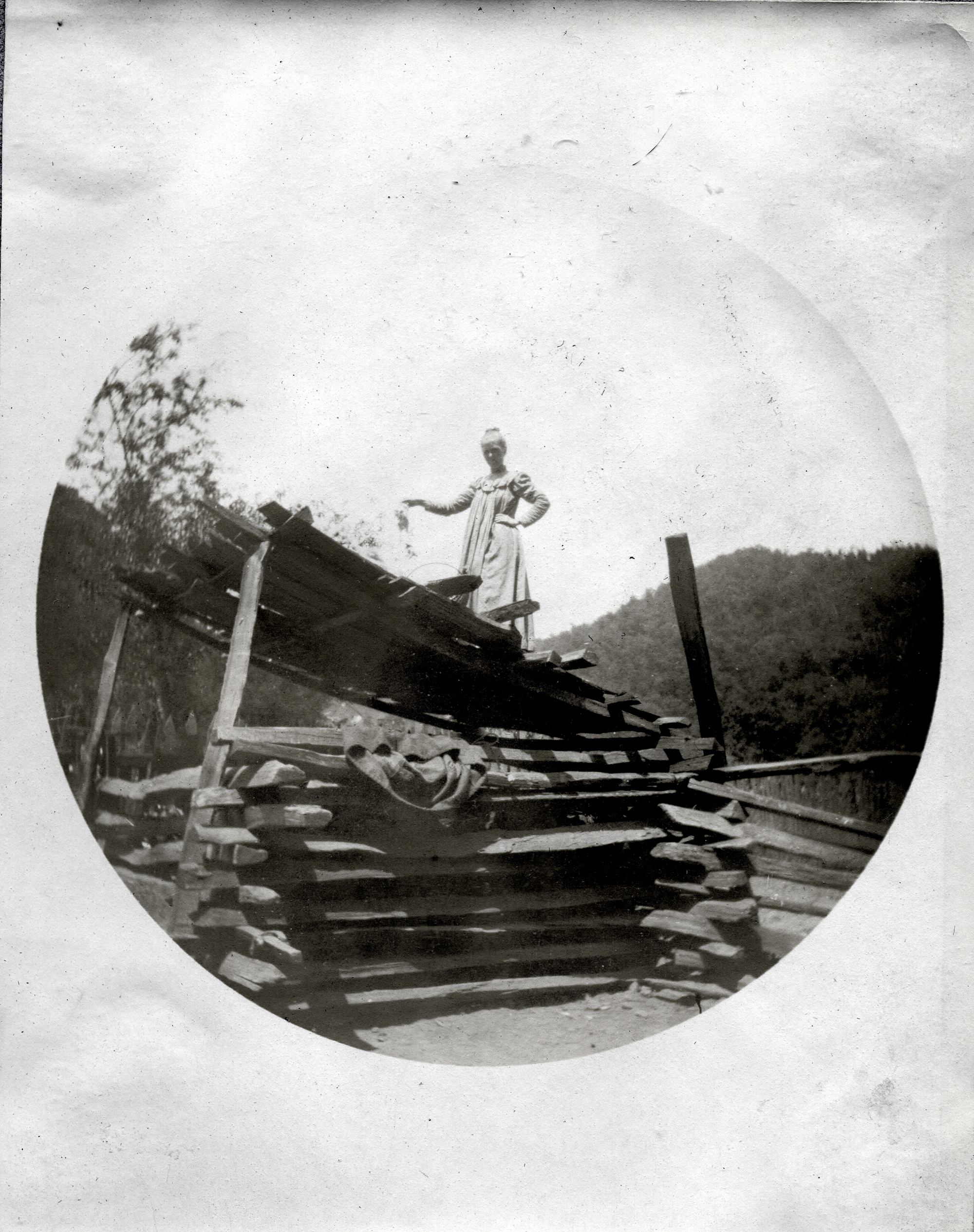 - Walking a foot log at summer camp, Sassafras, KY, 1901. Katherine Pettit Sassafras Album. [sas_004.jpg]