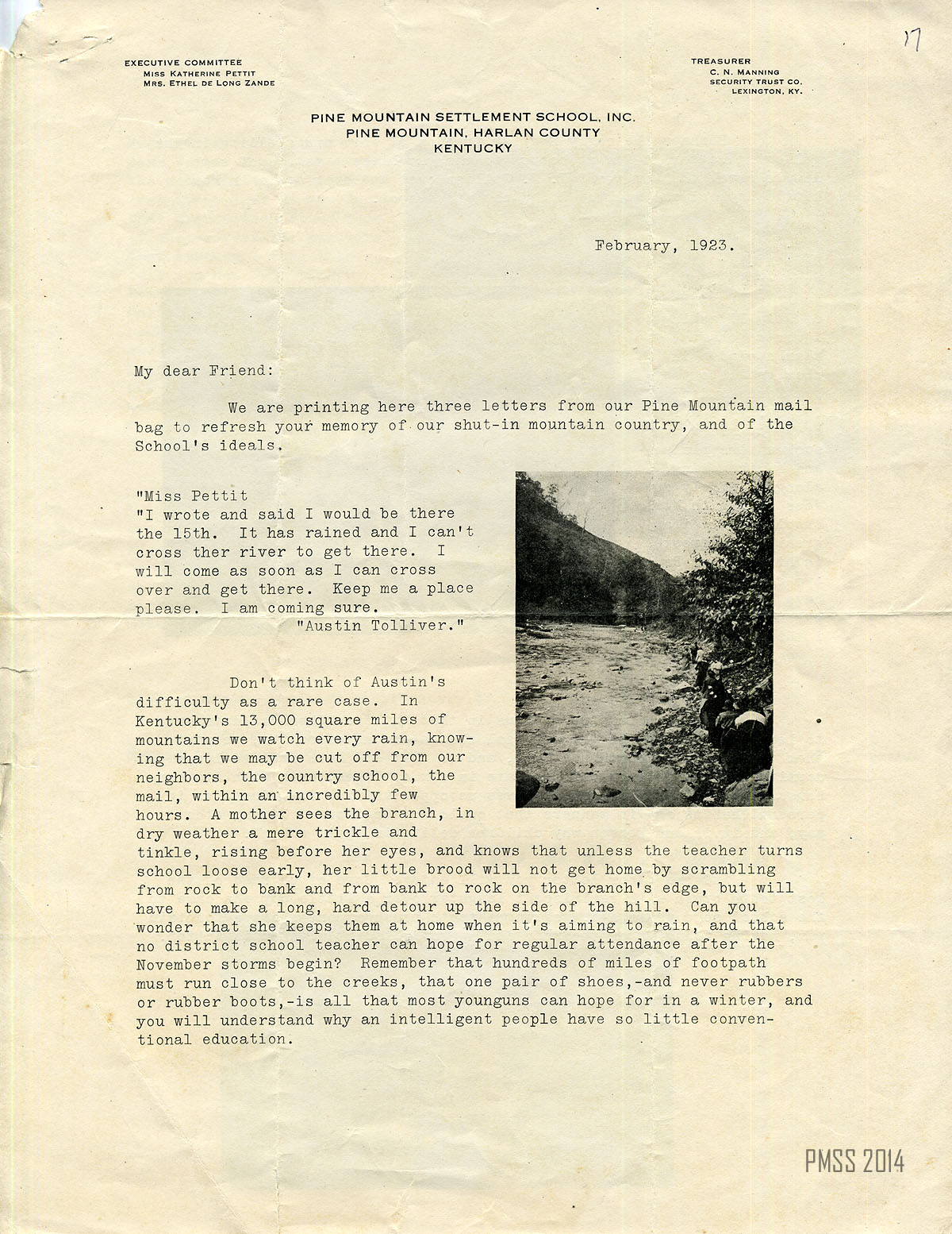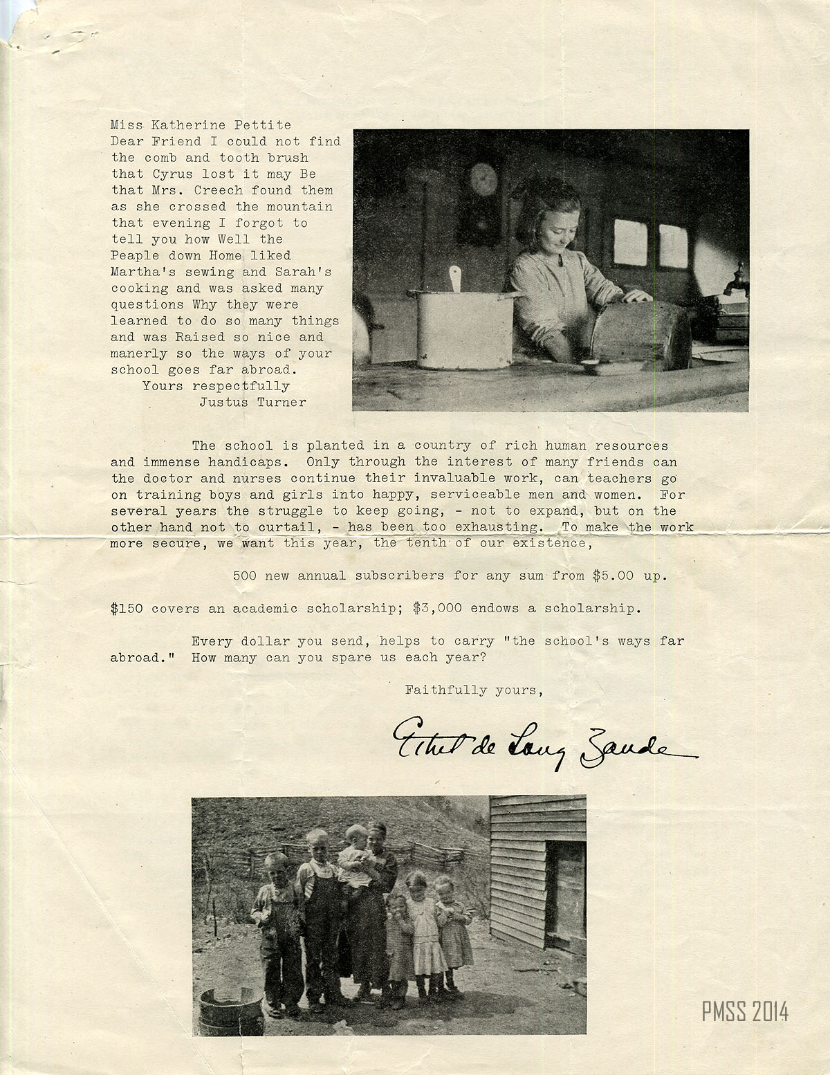 Dear Friend Letters 1923 consists of one 3-page letter that includes the following subjects: Quoted 3 letters from Pine Mountain mail bag ; students may be absent because of weather and terrain ; Pine Mountain is like a home to students with 6 cottages and housemothers instead of large dormitories ; friends’ donations help continue the work of the doctor, nurses, and teachers ; need 500 new annual subscribers ; $150 covers an academic scholarship ; $3,000 endows a scholarship ; signed by Ethel de Long Zande ;