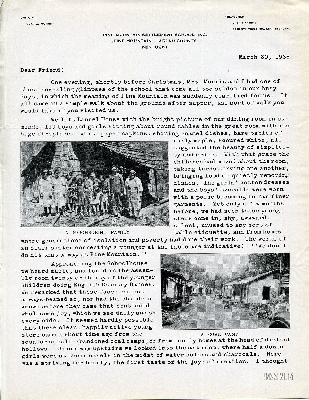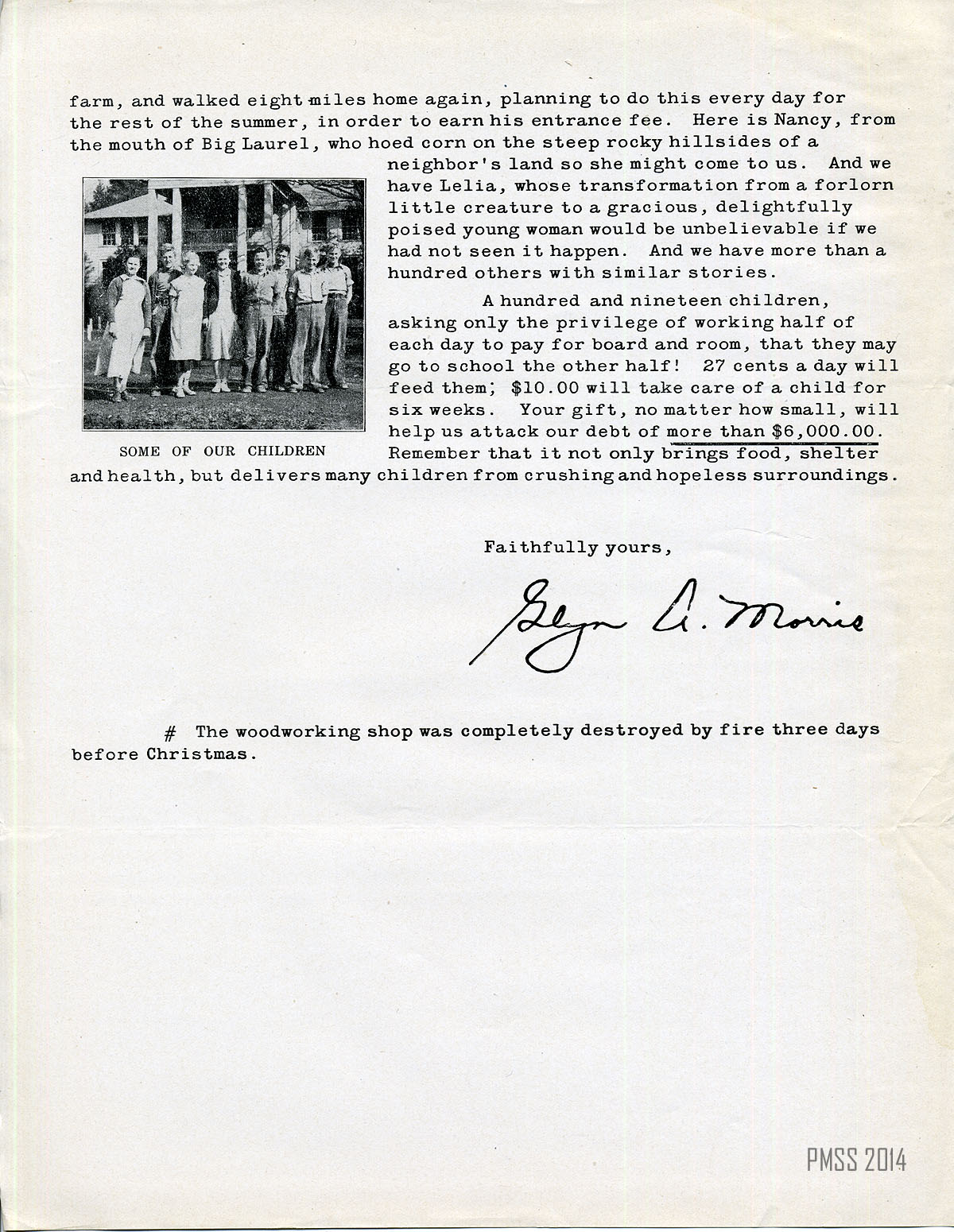 Letterhead lists names of director and treasurer ; describes Mr. and Mrs. Morris’s walk past various activities indicating the positive effects of PMSS on the children: 119 children at dining tables in Laurel House ; 20 or 30 younger children doing English Country Dances and painting pictures in the Schoolhouse ; children studying in the library ; boys playing basketball in the playground ; 10-12 girls working in Big Log ; students working in the woodshop ; stories of students working hard to earn their entrance fees ; 119 children willing to earn their room and board ; need 27 cents a day to feed each child ; PMSS debt is over $6,000 ; your gift rescues the children ; signed by Glyn A. Morris ; fire destroyed woodshop ;