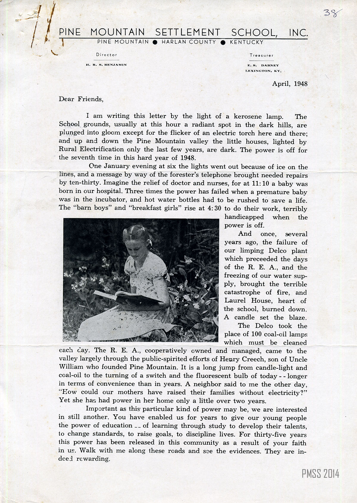 I am writing this letter by the light of a kerosene lamp. The School grounds, usually at this hour a radiant spot in the dark hills, are plunged into gloom except for the flicker of an electric torch here and there; and up and down the Pine Mountain valley the little houses, lighted by Rural Electrification only the last few years, are dark. The power is off for the seventh time in this hard year of 1948.