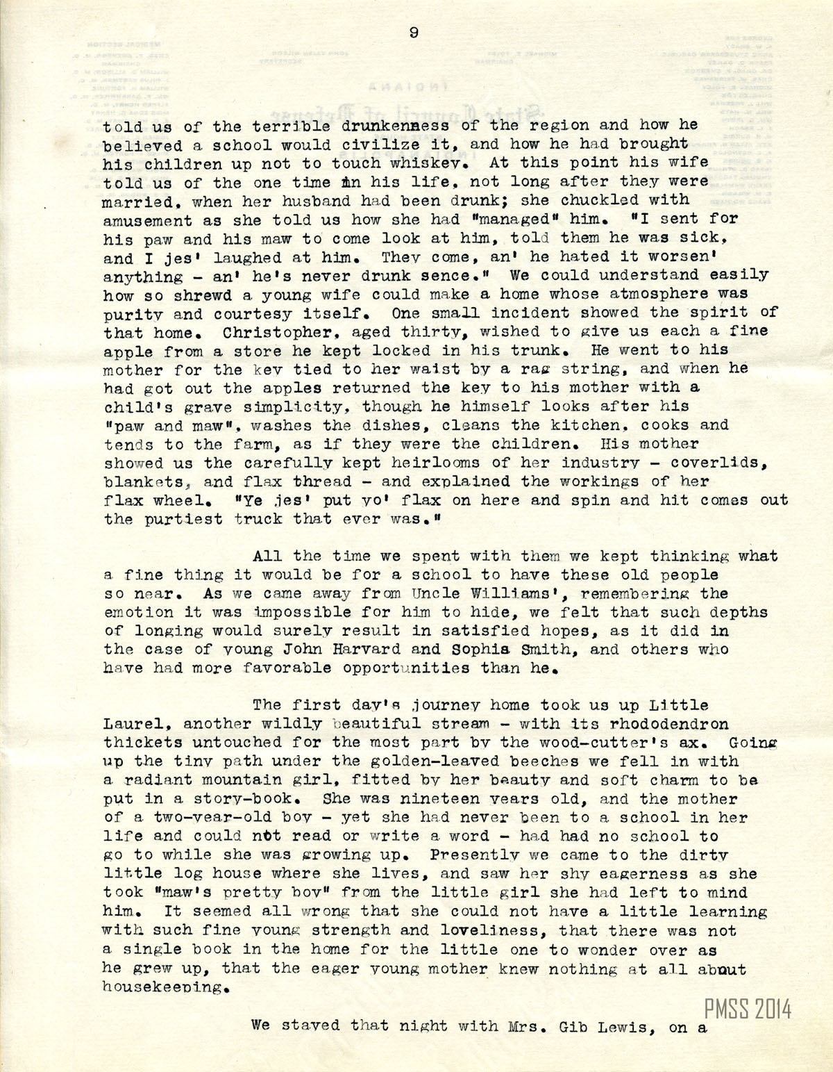 The Hindman group started out on a November morning in a wagon driven by Guilford, a Hindman student, and traveled from one creek to another. When they stopped at the gap to rest the horses and eat their dinner, a neighbor came with horse feed and told stories about his children and their meager education because they lived so far from a school. She describes the homes along Bull Creek as “miserable.”
