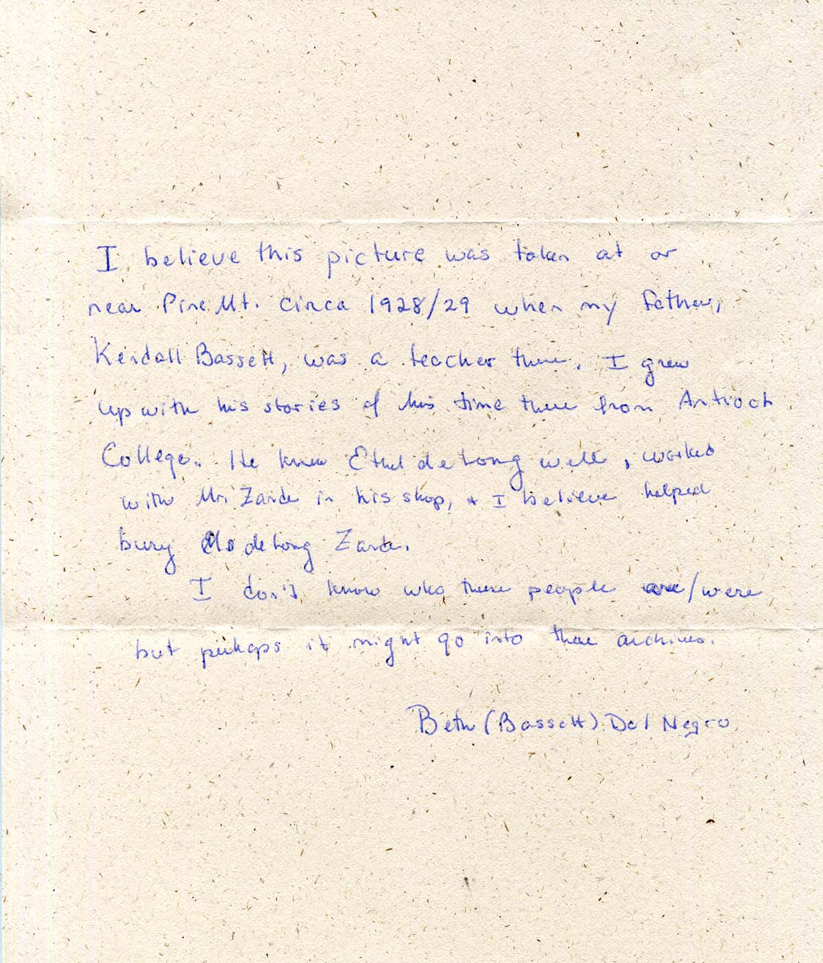 - Note regarding Kendall T. Bassett at Pine Mountain Settlement School from Beth dal Negro, daughter. [dal_negro_004.jpg]