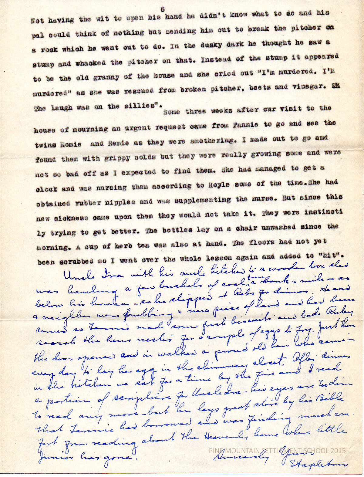 It happened on the same morning that Bascoil (as he spells “Basil”) McDaniel’s brother-in-law to Florence made his first visit to the Cabin on behalf of his family which I had visited several times on distant Beech Fork. I had found them all sick, mother Olly, baby and oldest daughter in one bed and the four-in-betweens huddled around the rusty old stove. I washed their sooty hands and faces then later sent them medicine along with some sheets and clothing. Now at this time they were in desperate need again. Basil said, “When you visited us before we were all sinners but now we are trusting in the Lord and mean to do what is right. We thank you for your help and want you to visit us again”. It made us glad to be able to pass on a medley of garments and soap that would make it possible for them all to strip and get cleaned again after weeks of illness. Since the lumbering in that section closed a year ago the people haven’t been able to earn any money and that means no clothing.