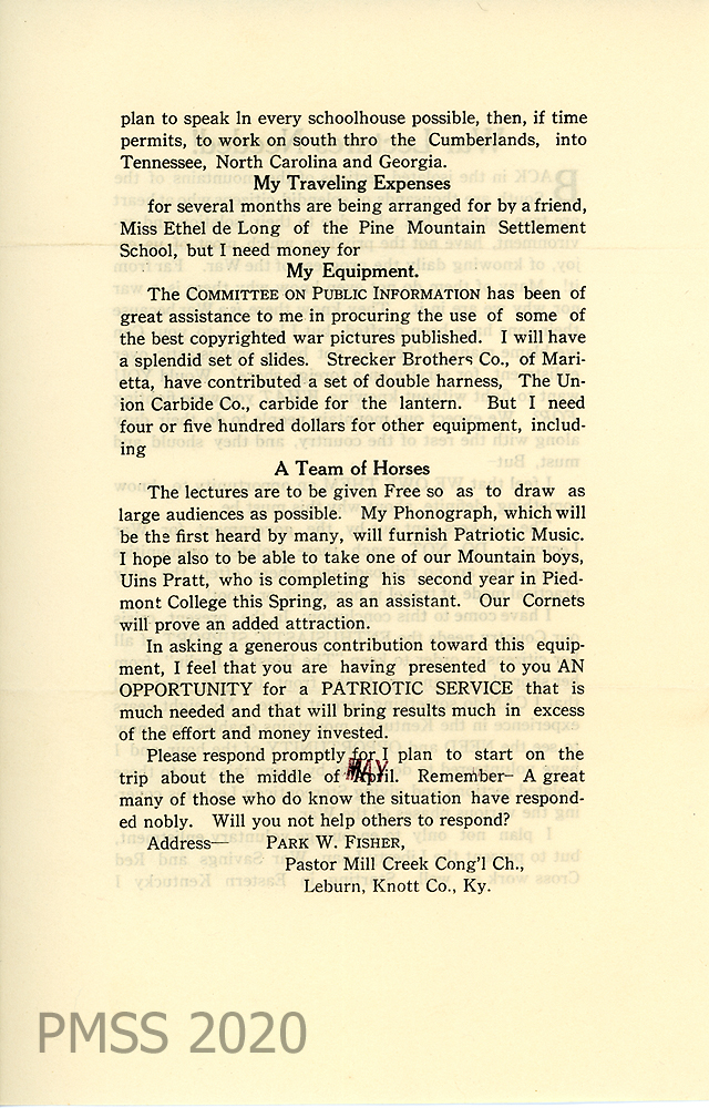 [076], [077] N.D. “War Lectures Needed!” Two-page printed fundraising handout from Park W. Fisher, Pastor Mill Creek Congregational Church, Leburn, Knott Co., KY. [DUPLICATE OF [005], [005a] except that, on page 2, “April” is crossed out and replaced with a handwritten “May.”)