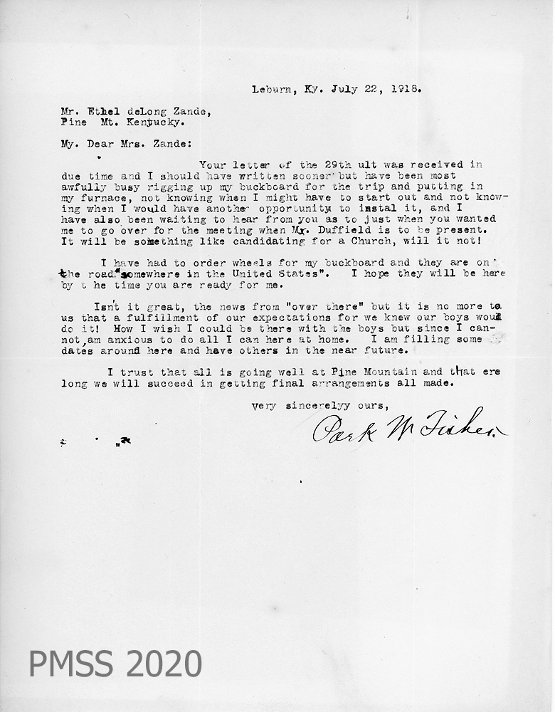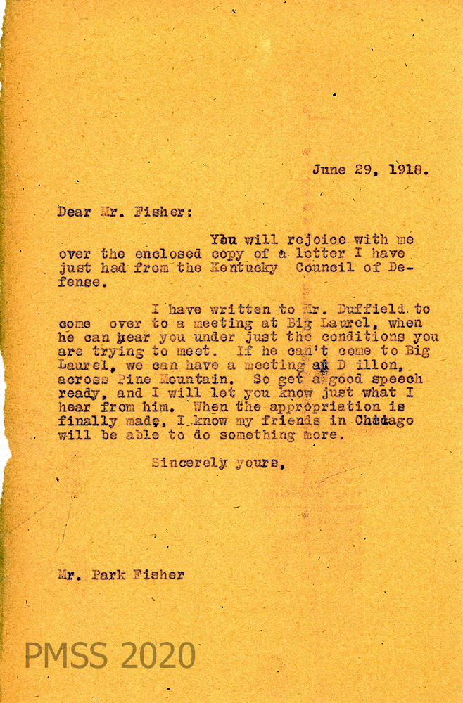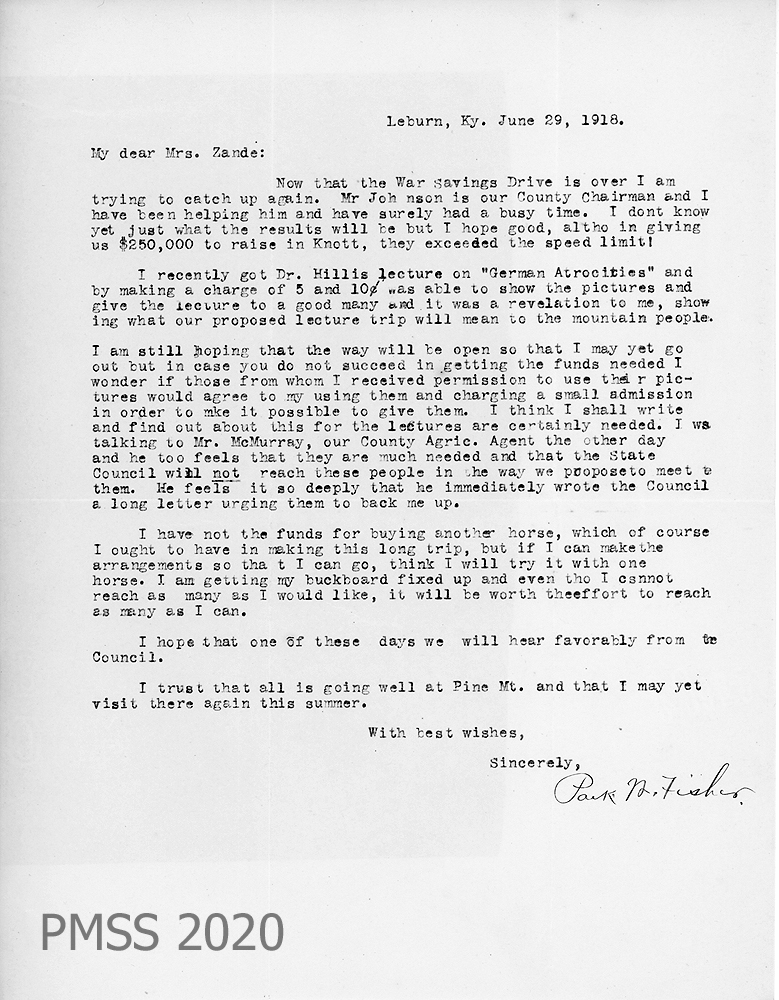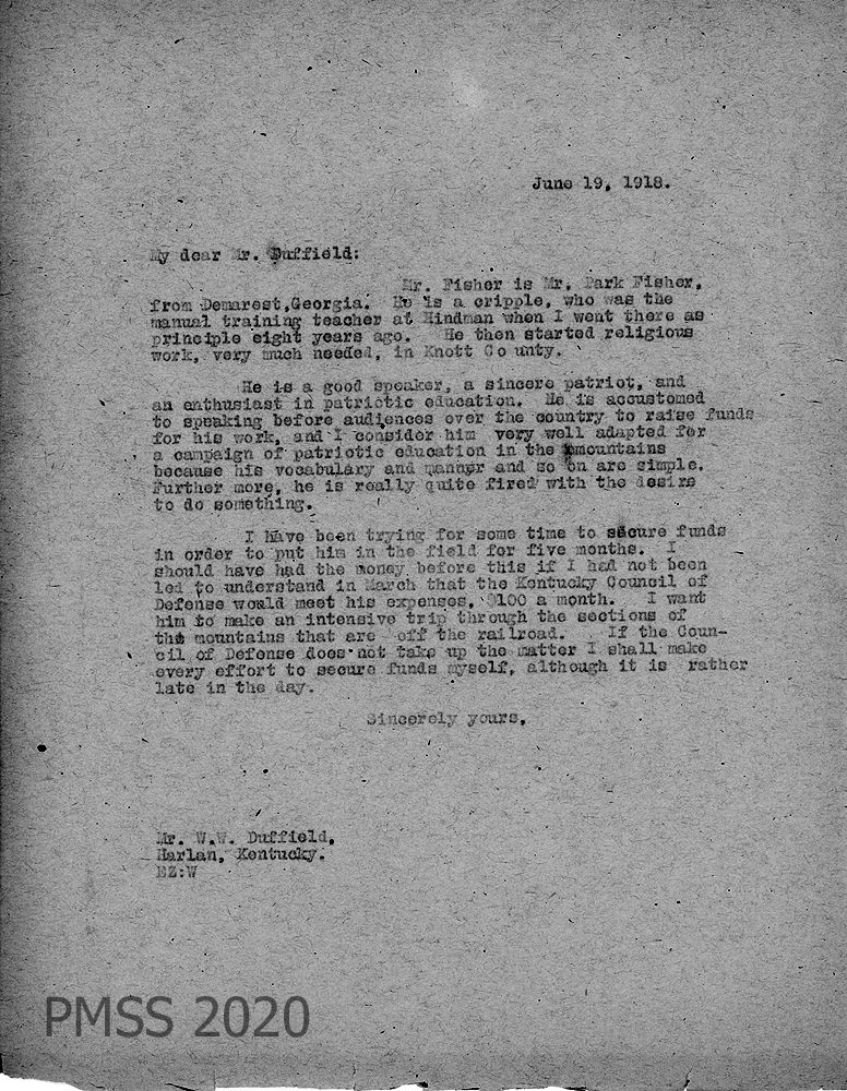[040] June 19, 1918. To Duffield from EZ (Zande), providing information about Fisher: “Mr. Park Fisher from Demarest, Georgia. He is a cripple, who was the manual training teacher at Hindman when I went there as a principal eight years ago. He then started religious work very much needed, in Knott County…a good speaker, a sincere patriot ….very well adapted for a campaign of patriotic education in the mountains because his vocabulary and manner and so on are simple….” Describes her fundraising for five months; being misled by the Kentucky Council of Defense that they would appropriate $100 a month. “I want him to make an intensive trip through the sections of the mountains that are off the railroad.”