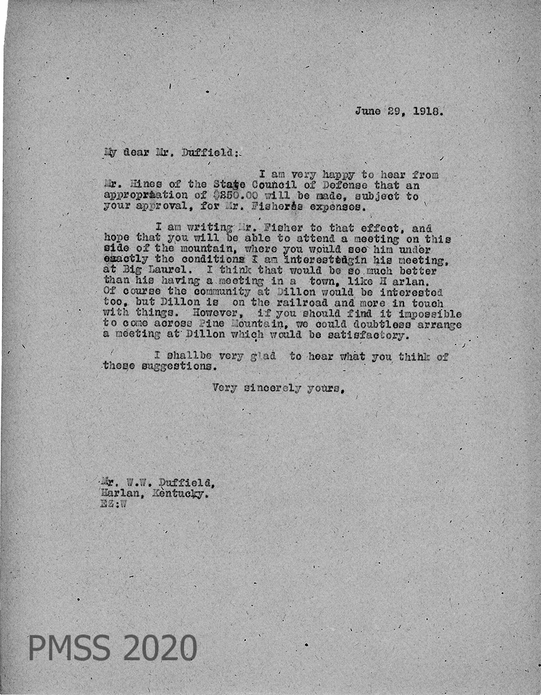 [045] June 29, 1918. To Duffield from EZ (Zande), acknowledging that $250 appropriation is subject to his approval; asks him to attend a meeting at Big Laurel, “where you would see him under exactly the conditions I am interested in…” or Dillon, which “is on the railroad and more in touch with things.”