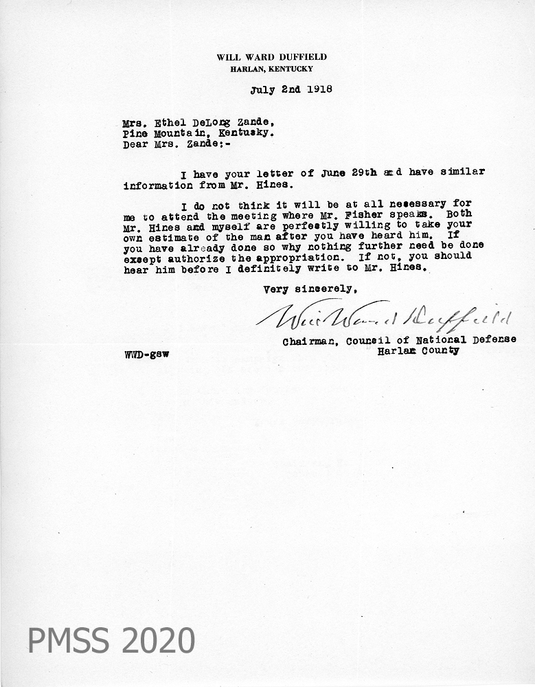 [043] June 29, 1918. To Fisher from [unsigned, apparently Zande] who encloses Hines’s June 27th letter. Duffield has been asked to a meeting at Big Laurel or Dillon. “When the appropriate is finally made, I know my friends in Chicago will be able to do something more.”