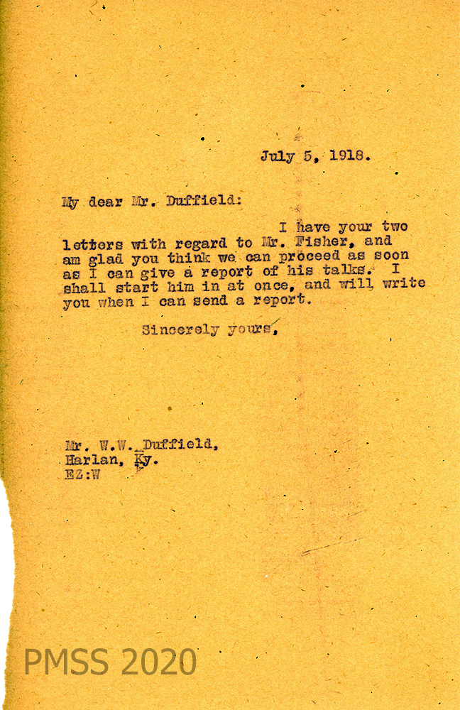 [048] July 5, 1918. To Duffield From EZ (Zande), who agrees to give a report of Fisher’s talks.