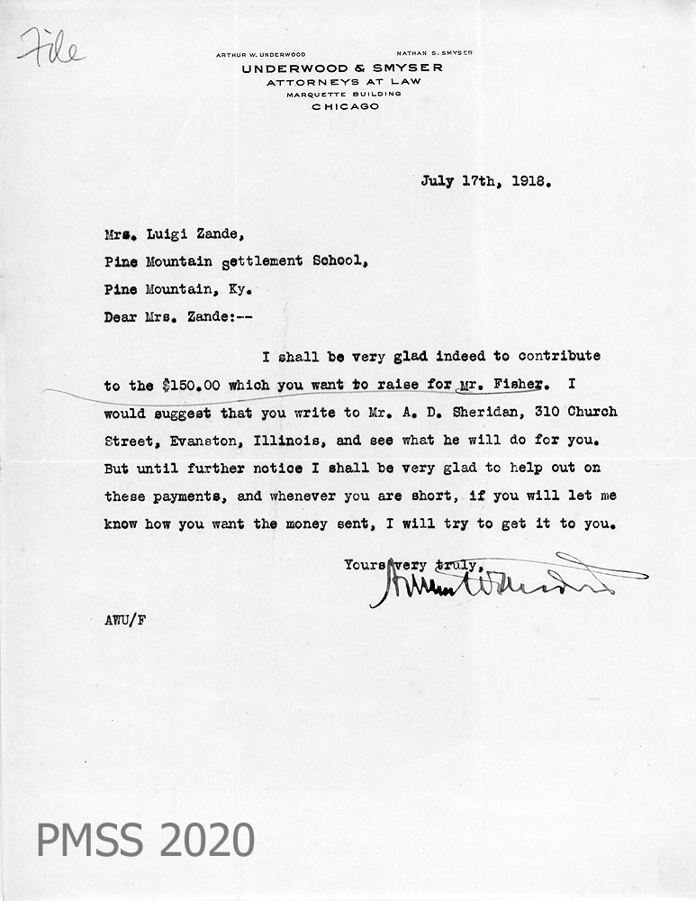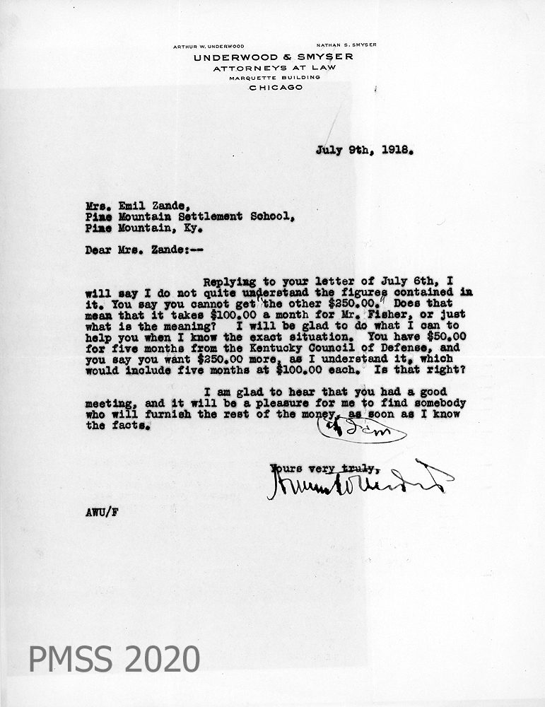 [052] July 17, 1918. To Zande from Underwood, who offers to get the $150 that is needed. Suggests she also ask Mr. A.D. Sheridan in Evanston, Illinois, for help.