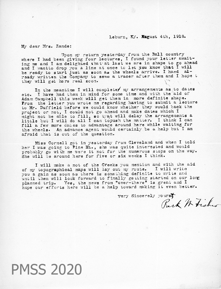 [057] August 4, 1918. To Zande from Fisher, who just returned from “The Ball country” where he gave four lectures; waiting for the wheels to arrive for his buggy. With Adam Campbell’s help he will complete his arrangements. Mentions Miss Cornell from Cleveland and her interest in PMSS.