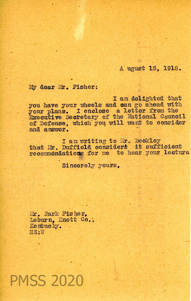 [060] August 15, 1918. To Fisher from EZ (Zande), who encloses Beckley’s letter which he should answer. She will let Beckley know that Duffield “considers it sufficient recommendations for me to hear your lecture.”