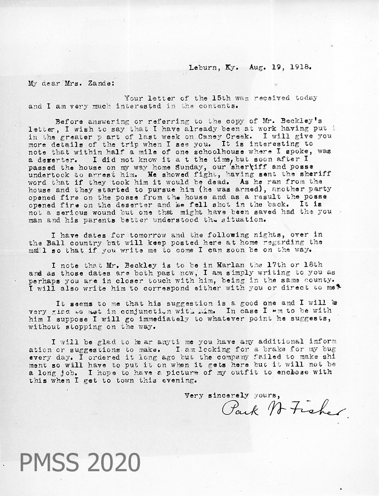 [061] August 19, 1918. To Zande from Fisher, who has been lecturing on Caney Creek and next in the Ball country; tells a story about a deserter, who would have been saved from being shot by the sheriff if he and his parents “better understood the situation.” Fisher agrees to Beckley joining him.