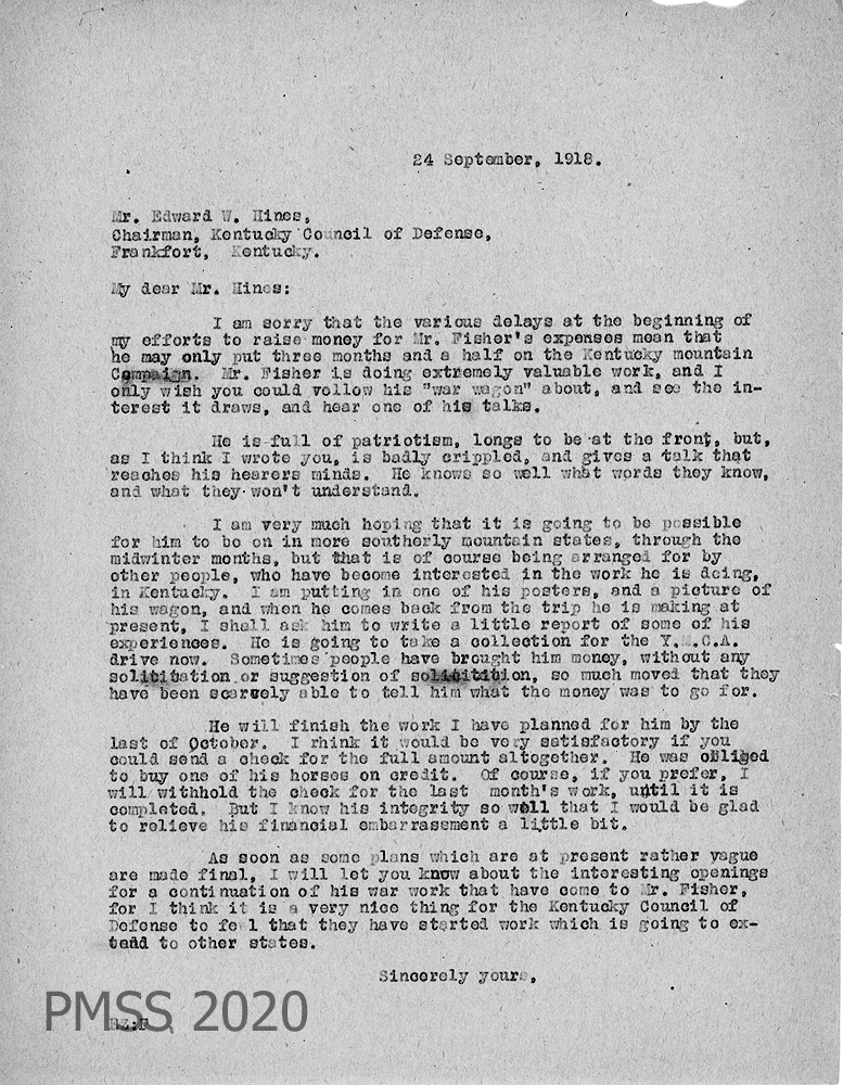 [067] September 10, 1918. To Hines from EZ (Zande). Various delays in fundraising has shortened Fisher’s campaign to only 3 1/2 months (until last of October); wishes Hines could follow Fisher’s “war wagon” and see his work. “He is full of patriotism, longs to be at the front, but… is badly crippled, and gives a talk that reaches his hearers’ minds. He knows so well what words they know, and what they won’t understand.” Zande encloses Fisher’s poster and picture of his wagon; Fisher will collect for the YMCA drive. Asks Hines to send a check for the full amount to ease Fisher’s financial stress. She will let Hines “know about the interesting openings for a continuation of his war work…”