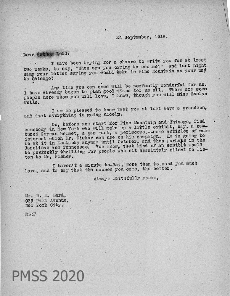 [068] September 24, 1918. To Father D. M. Lord, NYC, from EZ (Zande), who is pleased he plans to visit PMSS; asks him to bring war objects for an exhibit at Fisher’s lectures.