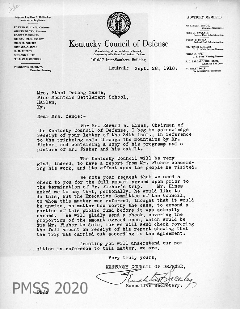[058] August 10, 1918. To Zande from Pendleton Beckley, Executive Secretary, Kentucky Council of Defense, Louisville, KY who will be in eastern Kentucky for three weeks and suggests that he could join Fisher on his trips through the mountains and Beckley could organize the County Councils as they proceed.