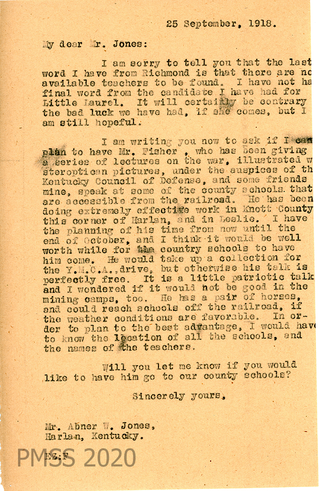 [070] September 25, 1918. To Mr. Abner W. Jones, Harlan, KY, from EZ (Zande), who regrets to tell him that Richmond cannot supply a teacher for Little Laurel; no work yet from her candidate for the position. Zande asks if Fisher and her friends can speak at the county schools near the railroad; describes Fisher’s work; asks for locations of the schools and names of the teachers.